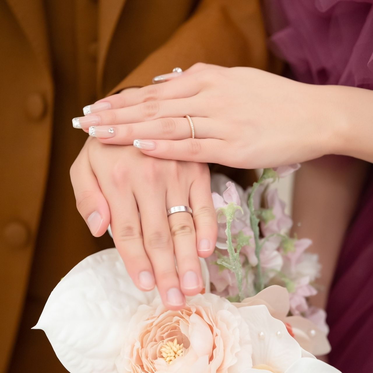 旦那さんはホワイトゴールドのロゴ入りのリングです。普段着用するアクセサリーに負けない存在感がありとてもおしゃれなデザインです!✨