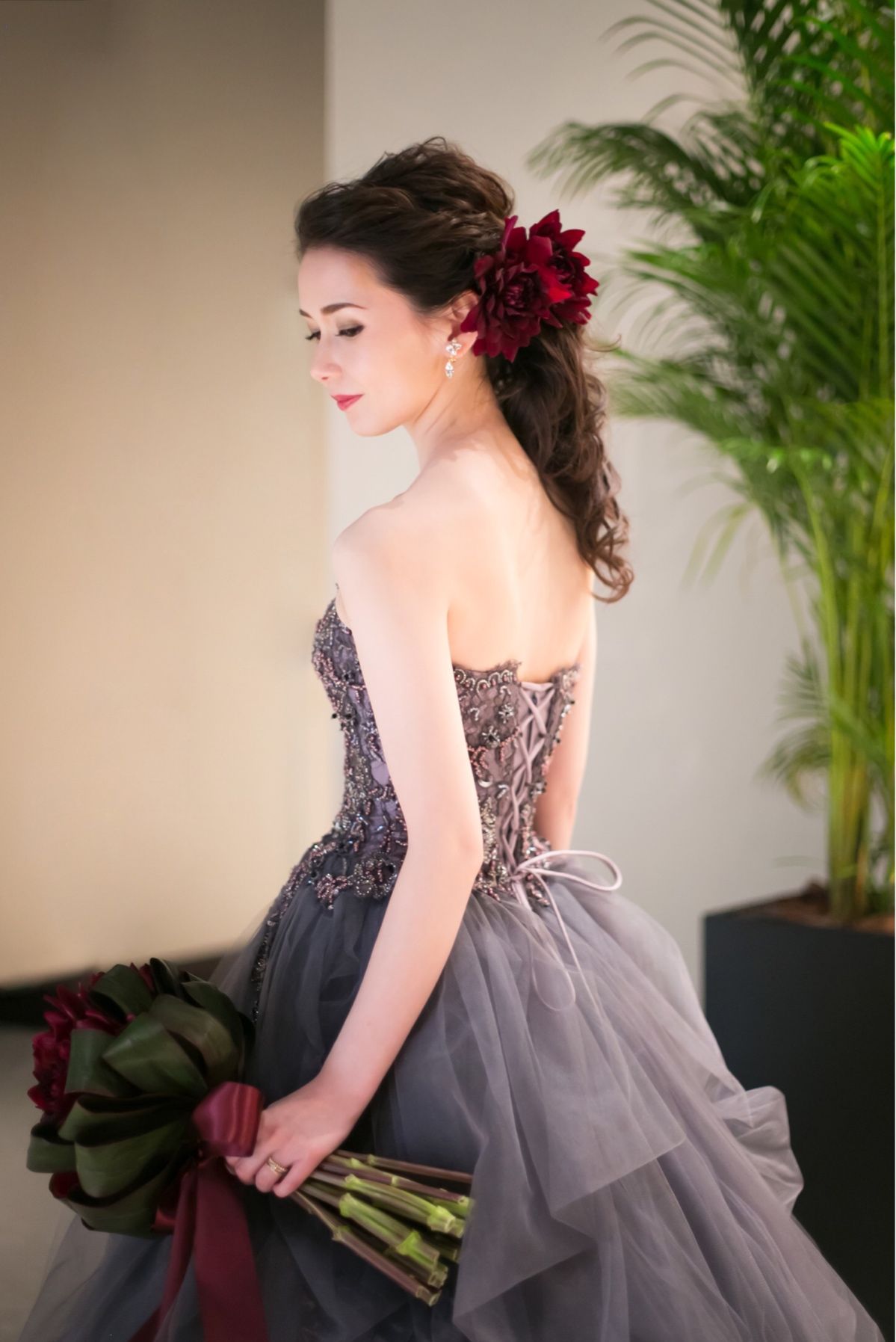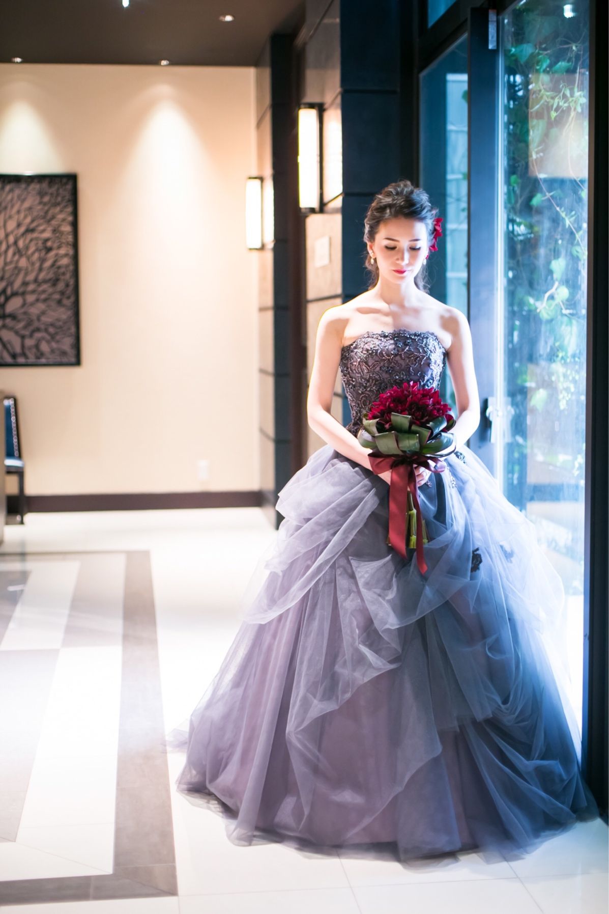 2着目:リブラブラフのオリジナルカラードレス くすんだパープルベースにグレーのチュールをあしらったカラードレスです