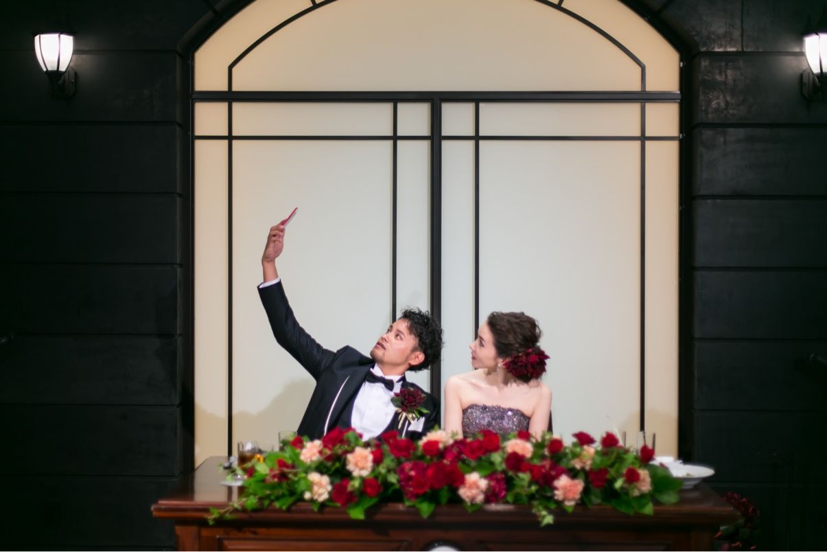 会場やドレスの雰囲気に合うよう、赤で花の種類も少なめで統一感をだしました。