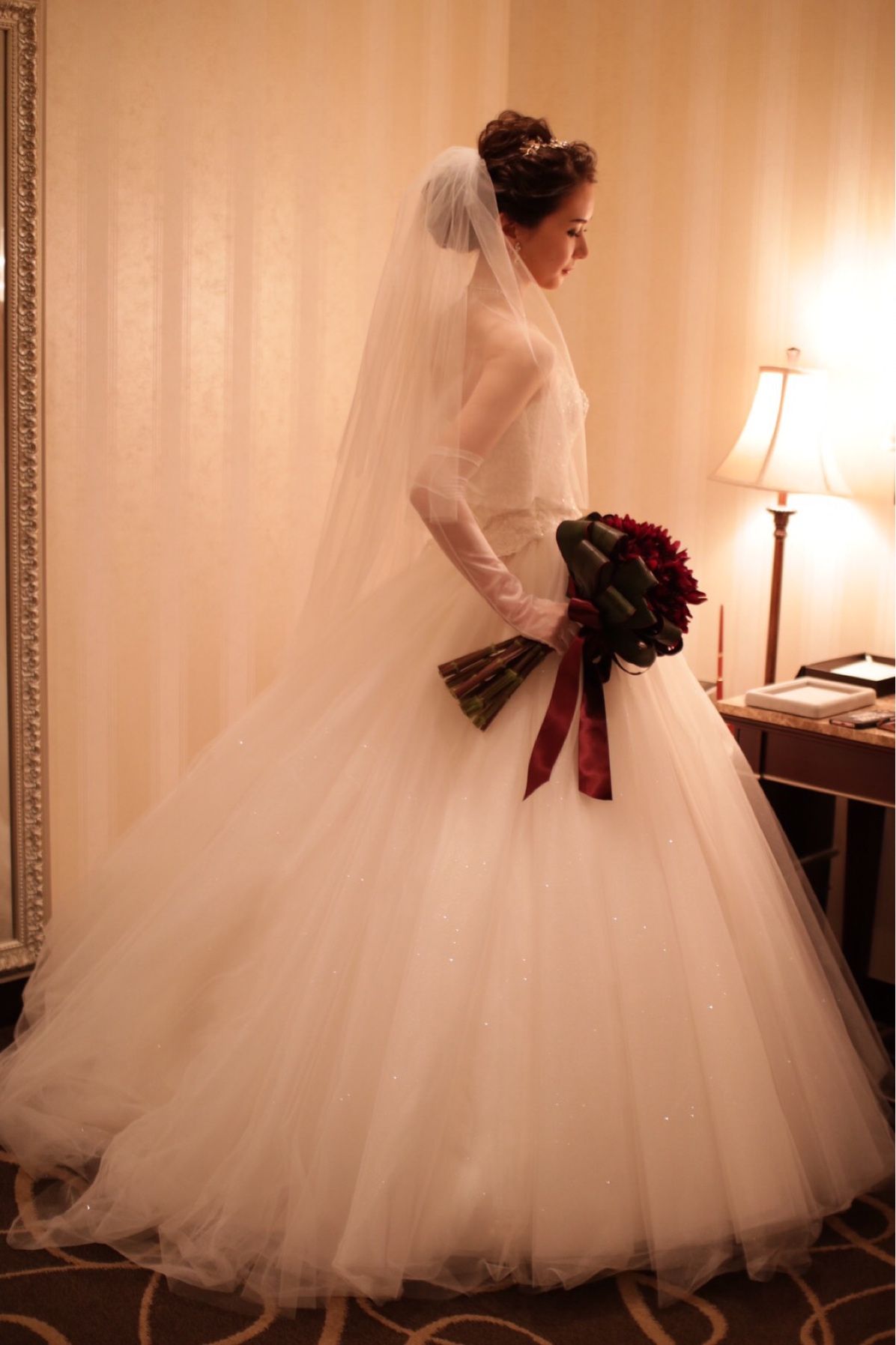本当はアントニオリーヴァのsissiかベラウォンのバレリーナドレスを着たかったのですがどちらも難しいとの事で、ドレス担当の方がバレリーナドレスに似た雰囲気のものをわざわざ取り寄せてくださいました。
