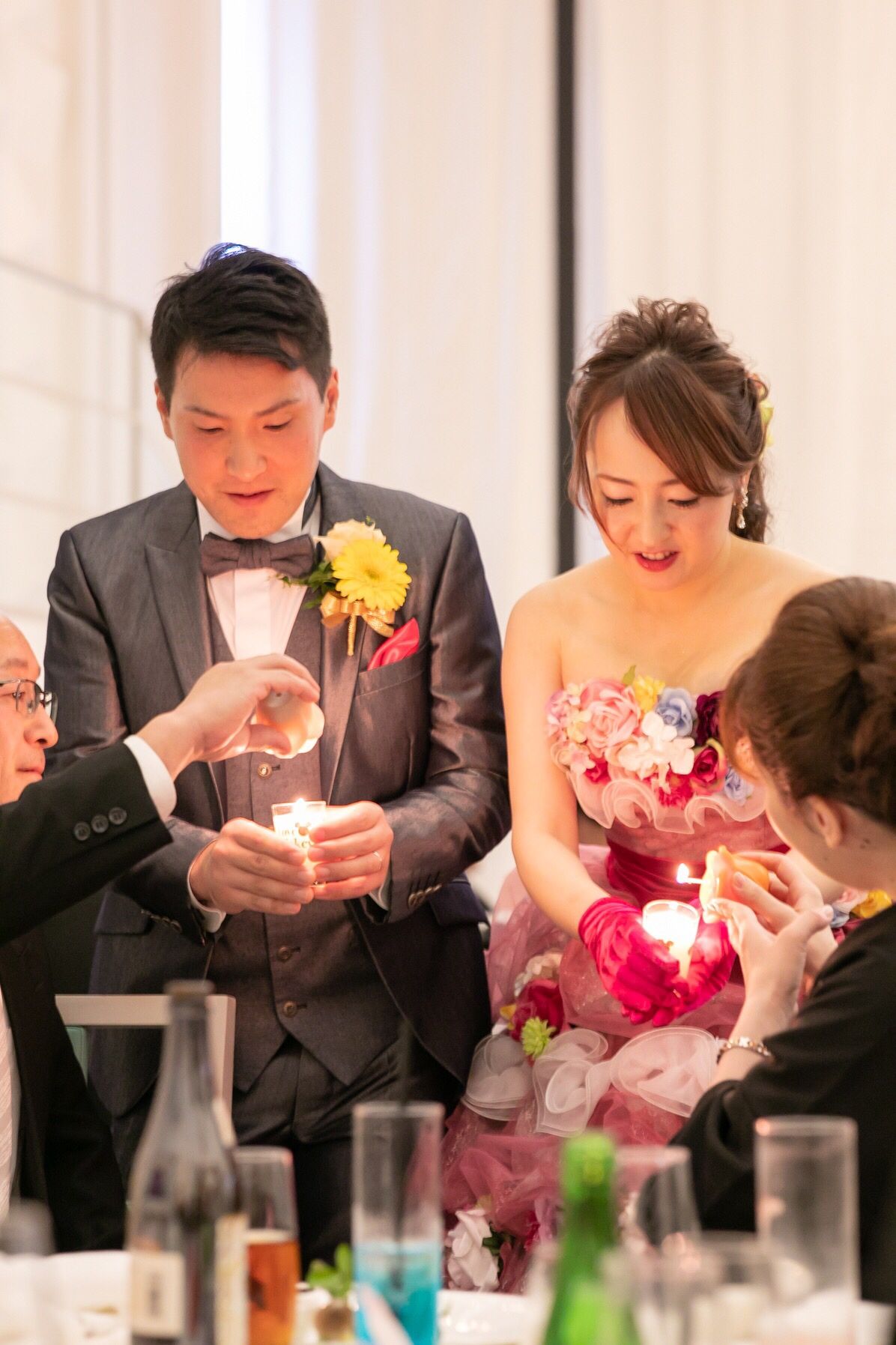 キャンドルリレーと、テーブルごとゲストとの写真を撮りたかったのですが、時間オーバーのため、写真を諦めてキャンドルリレーをやりました。