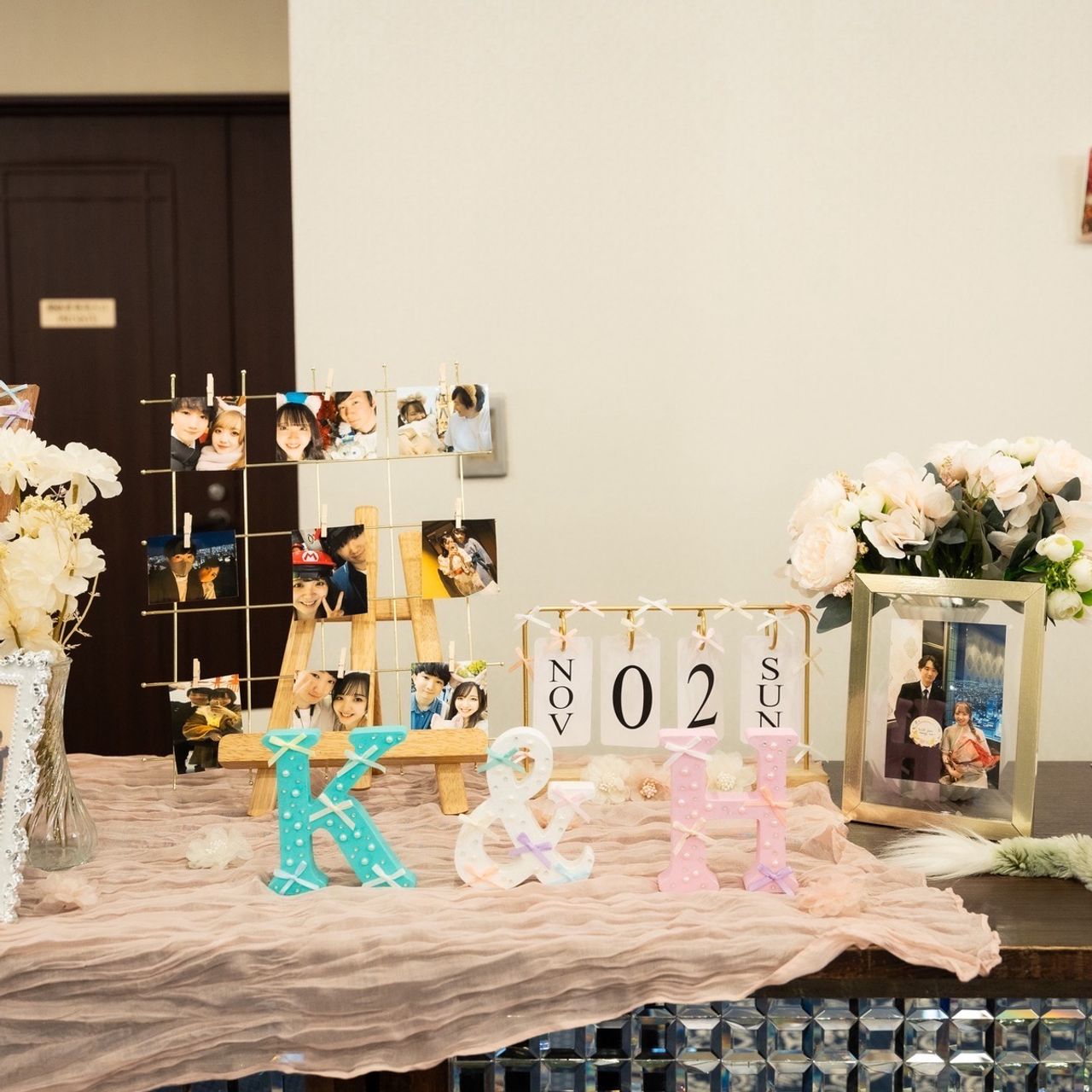 大人可愛く、自分達の好きなかすみ草を入れ、ピンク、水色を差し色に入れています。