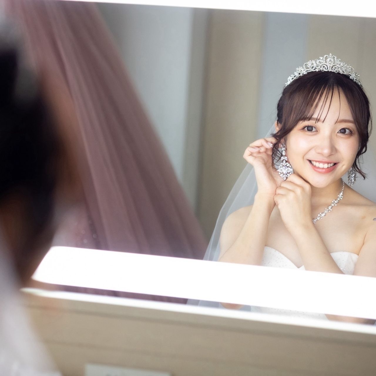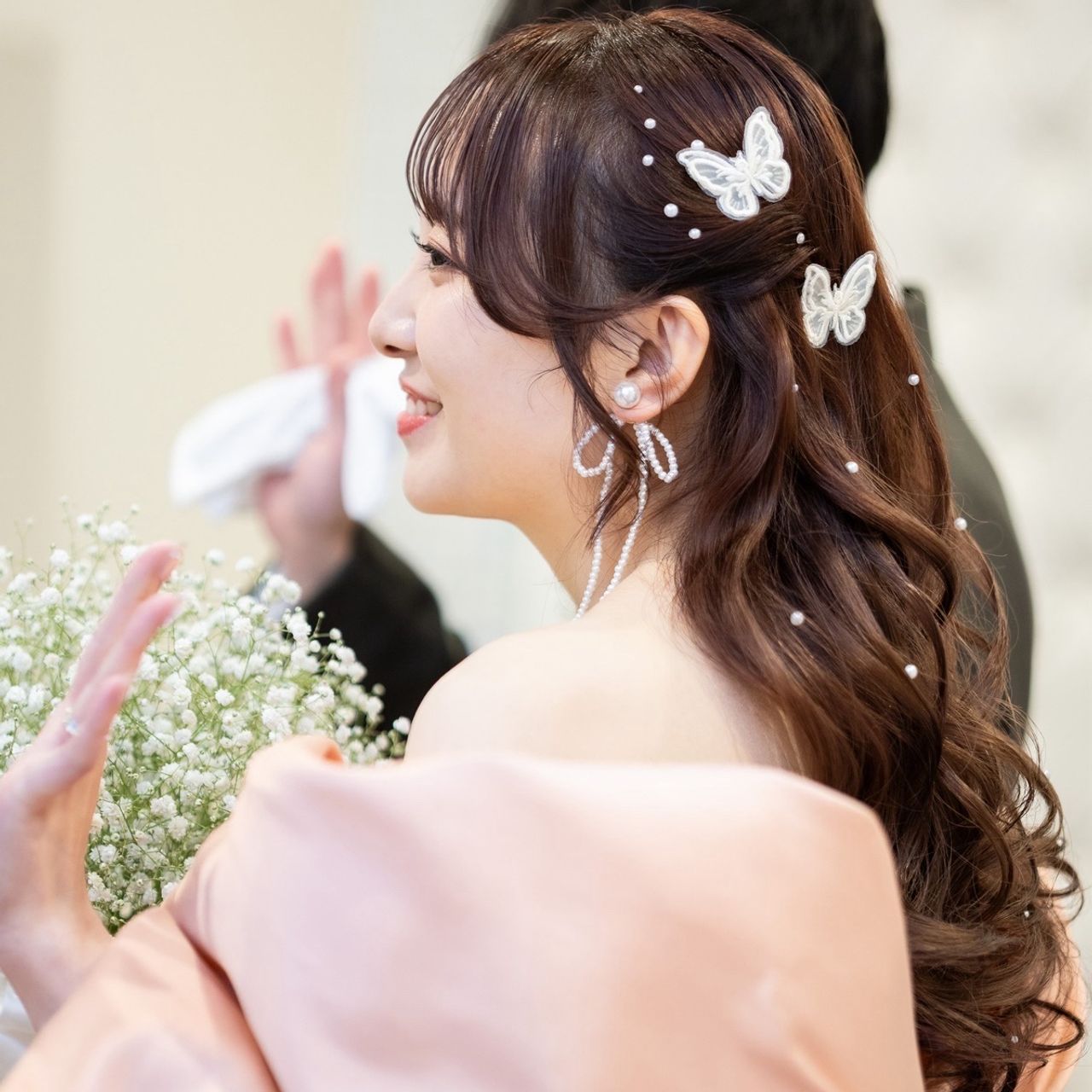 挙式ではティアラ、披露宴(ウェディングドレス)では大きめのクラウン、カラードレスでは蝶々のピンとパールシールを着けました。