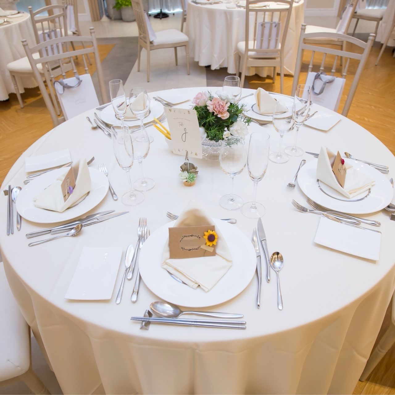・装花のボリュームを抑え、カードスタンドに造花をつけ華やかさを演出