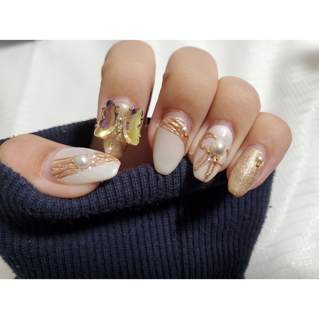 ヘアアクセと同様に、蝶々を入れたくて100均で気に入ったのを探してネイリストさんに持ち込みで付けてもらいました。