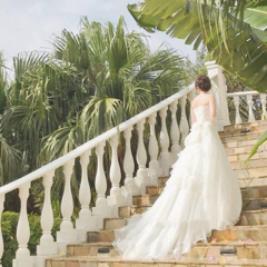 前はシンプルで、後ろのトレーンが様々なレースを使っており後ろ姿が大変映えました。