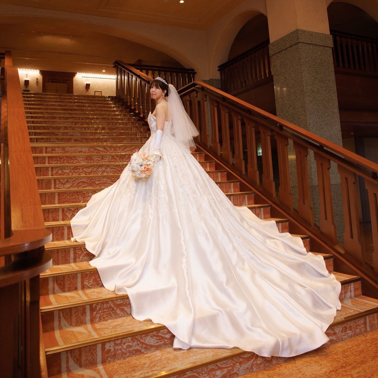 ホテルで行われたブライダルフェアの模擬挙式で、新婦役の方が着用されており、チャペルとの相性の良さに惹かれました。上質なサテン生地に刺繍が施されていて、とても綺麗なドレスです。トレーンも長く、後ろ姿も華やかなのが魅力です。