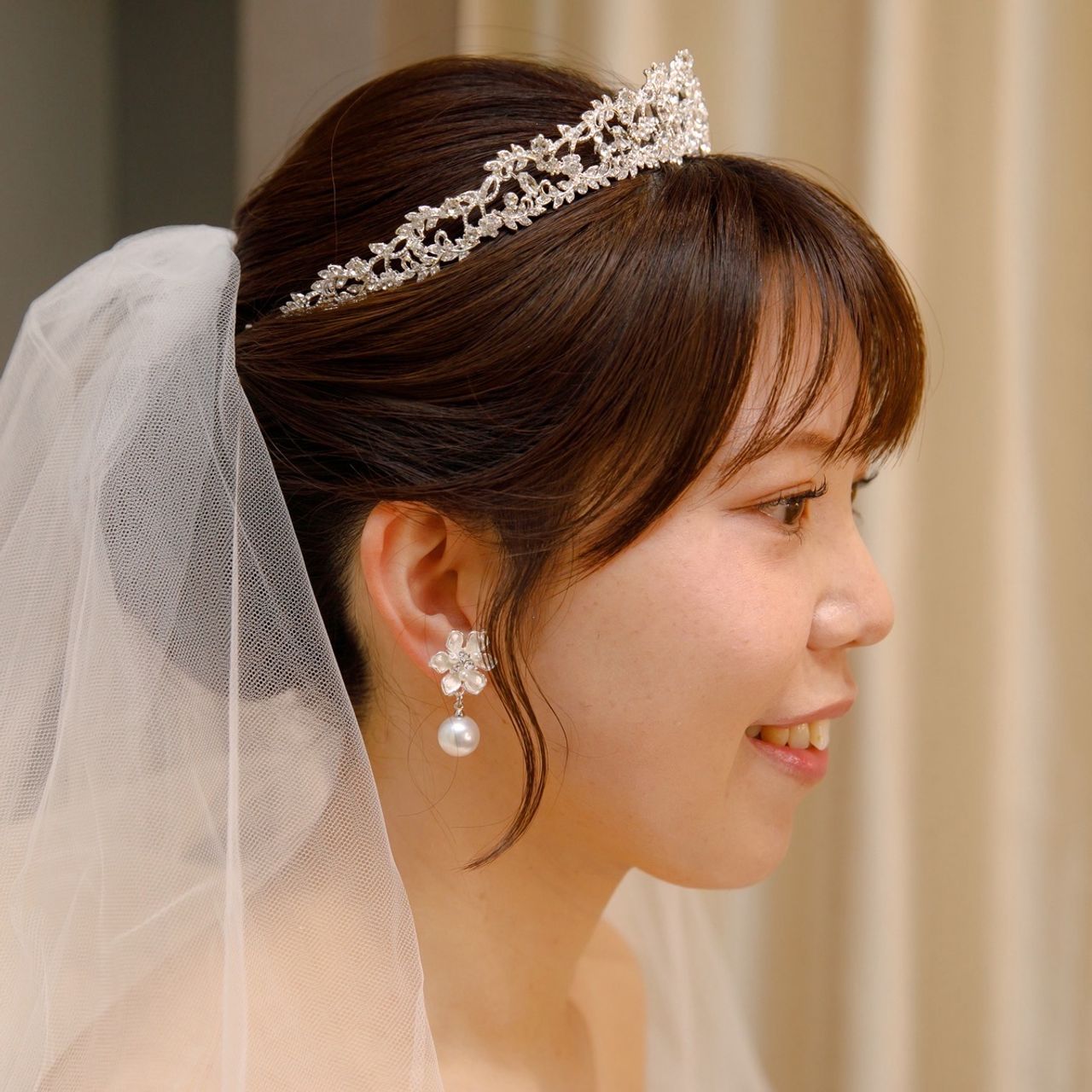 どこから見ても綺麗に写るように、幅が広めのティアラにしました。私はストーンの大きなティアラが似合わなかったため、小ぶりなストーンでも豪華に見えるティアラを選んでいます。実店舗で試着して選びましたが、ティアラは試着して選ぶことをオススメします。
