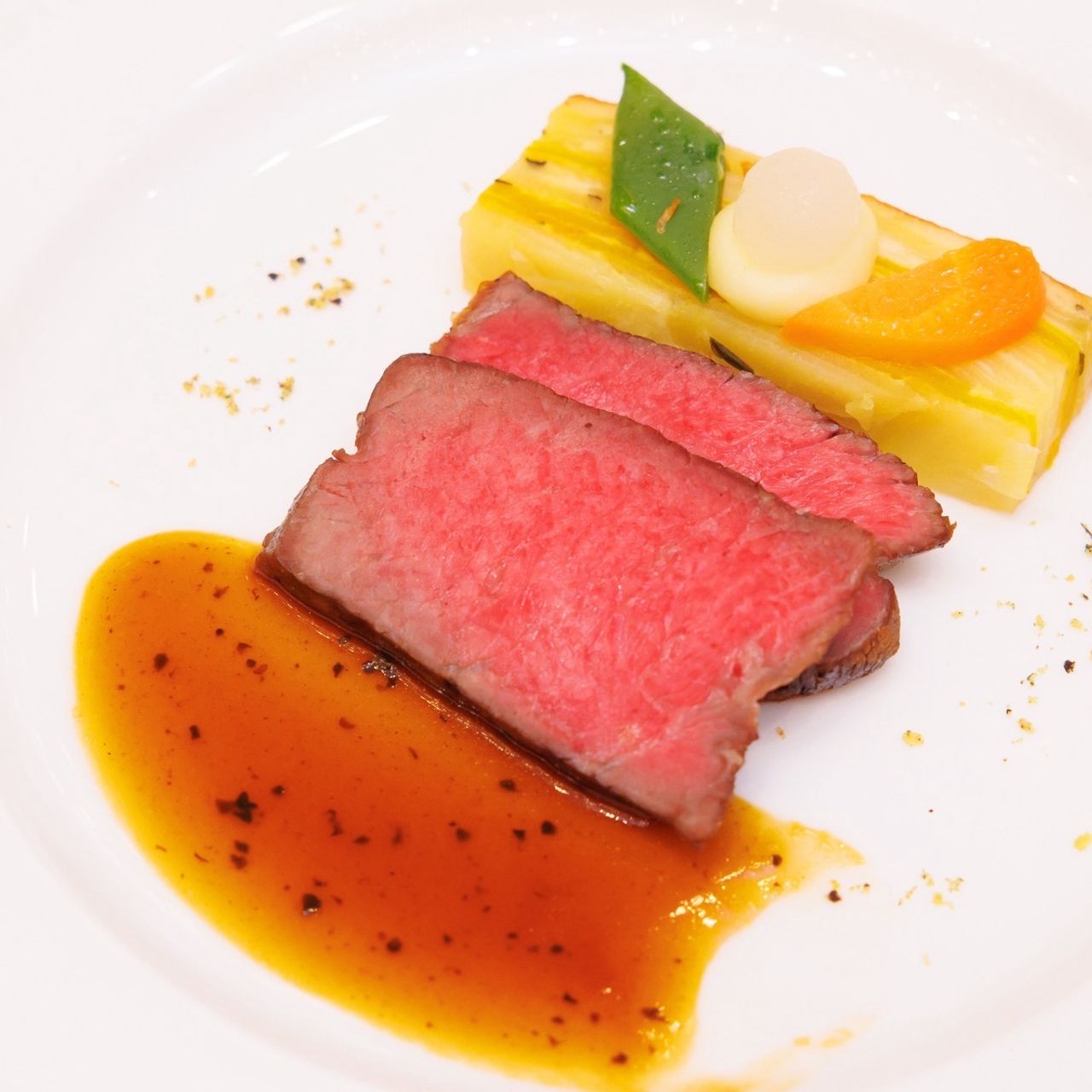 式場見学の際に、実際に食べてとてもおいしかったので、3つのコースの中から「ソナタ」を選びました。私たちはカスタマイズしませんでしたが、コース料理を1品単位で別の料理にも変更可能で、オリジナルなコースを作れるのも魅力的でした。