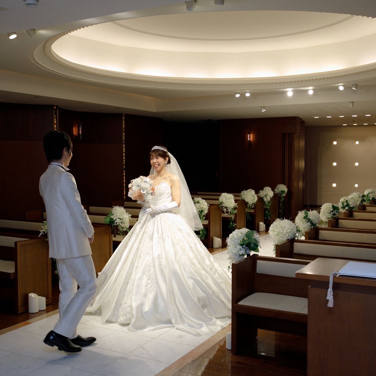 照明を使ったバージンロードでの演出に魅力を感じて、チャペルでの挙式にしました。重厚感のあるクラシカルなチャペルで、屋内のため天気に左右されないのもいいところです。