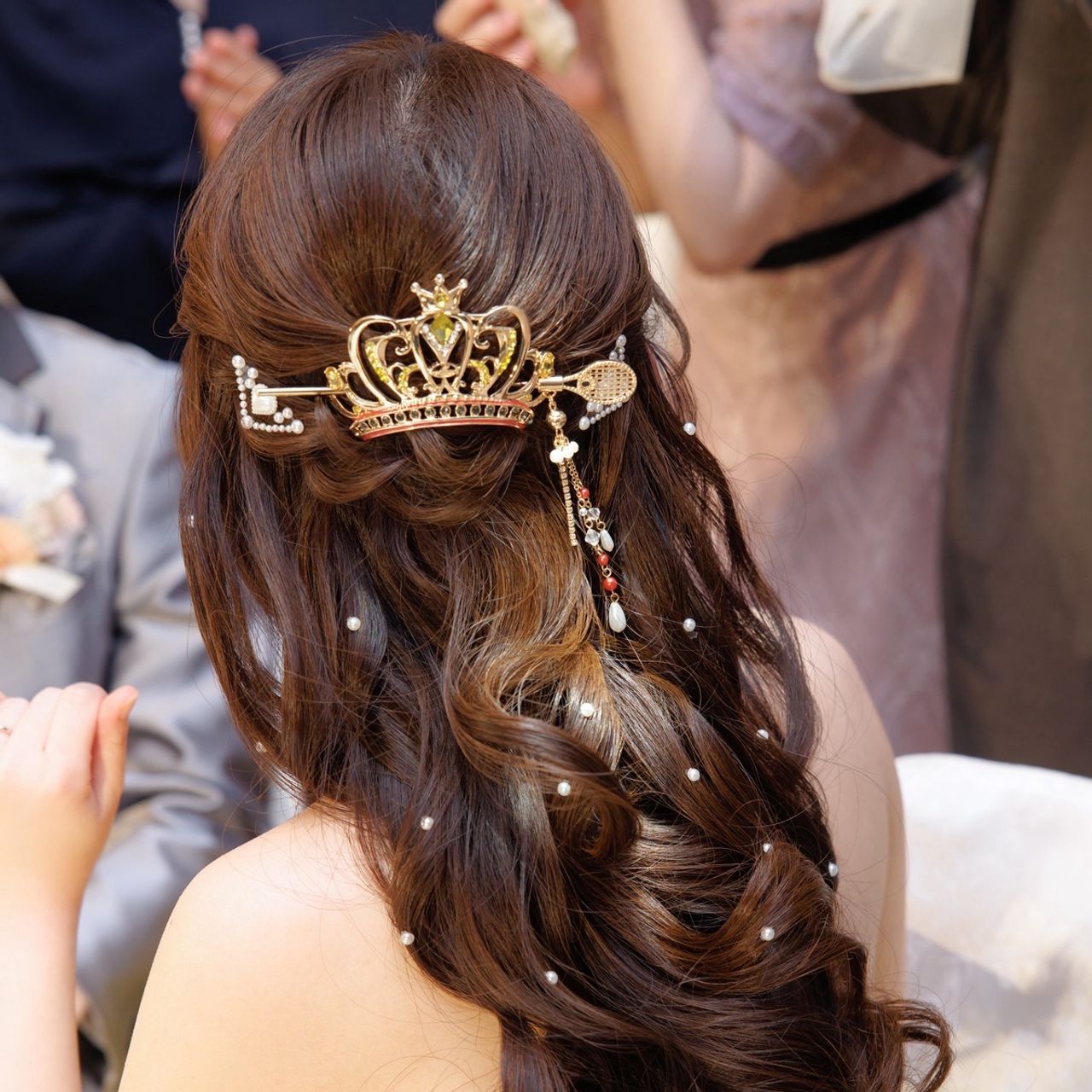 カラードレスでは、可愛くしたかったので巻き髪ダウンスタイルにしました。