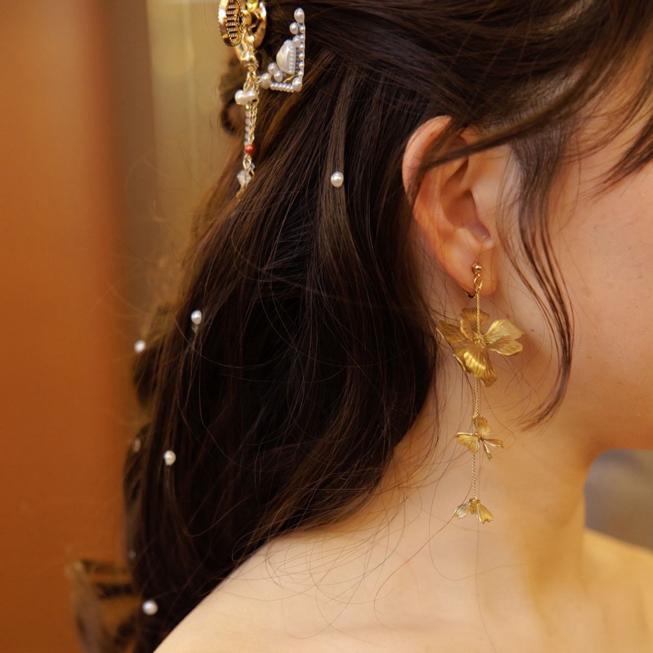 ドレスに合わせて、ウェディングドレス着用時はお花とパールのイヤリング、披露宴ではゴールドの大振りなイヤリングにしました。