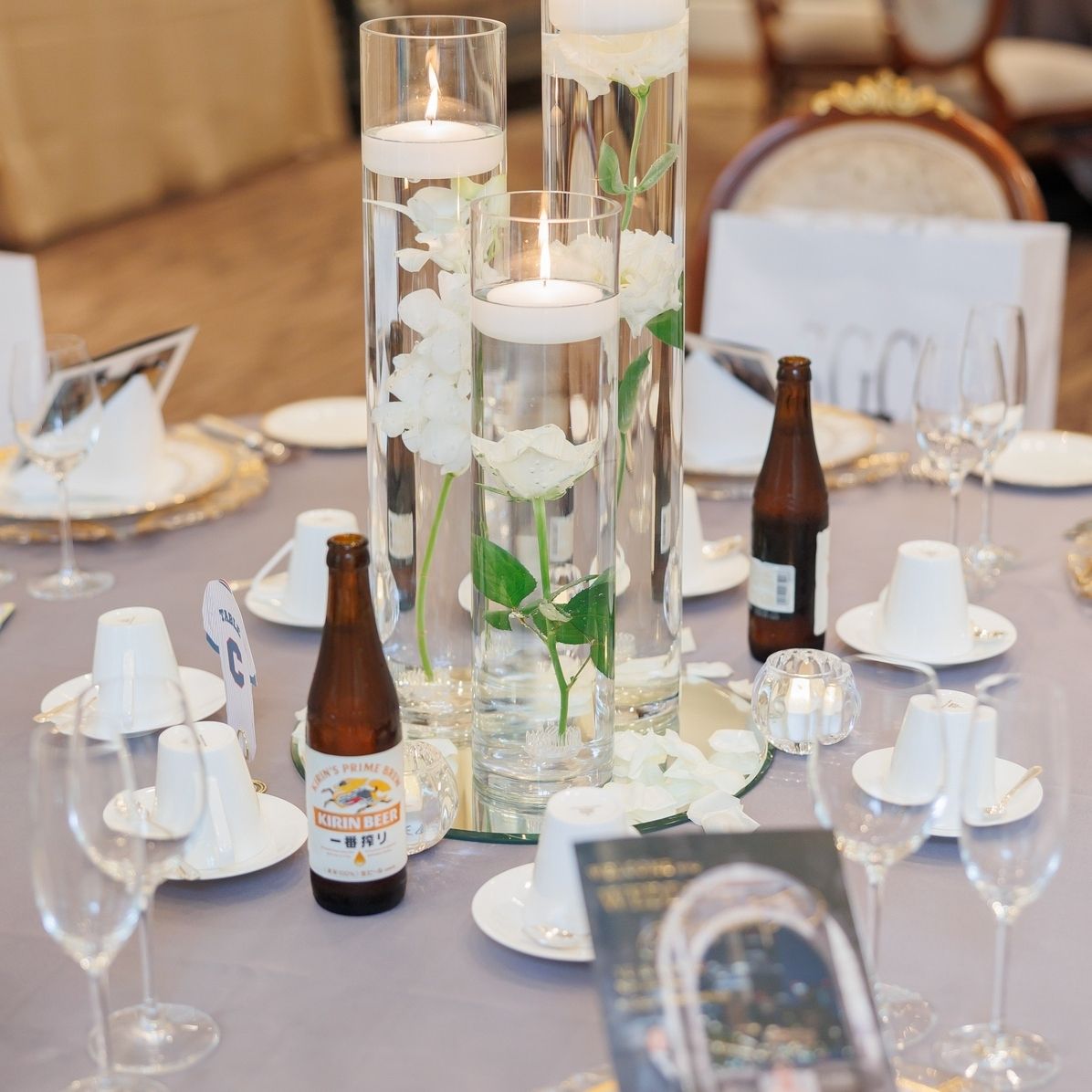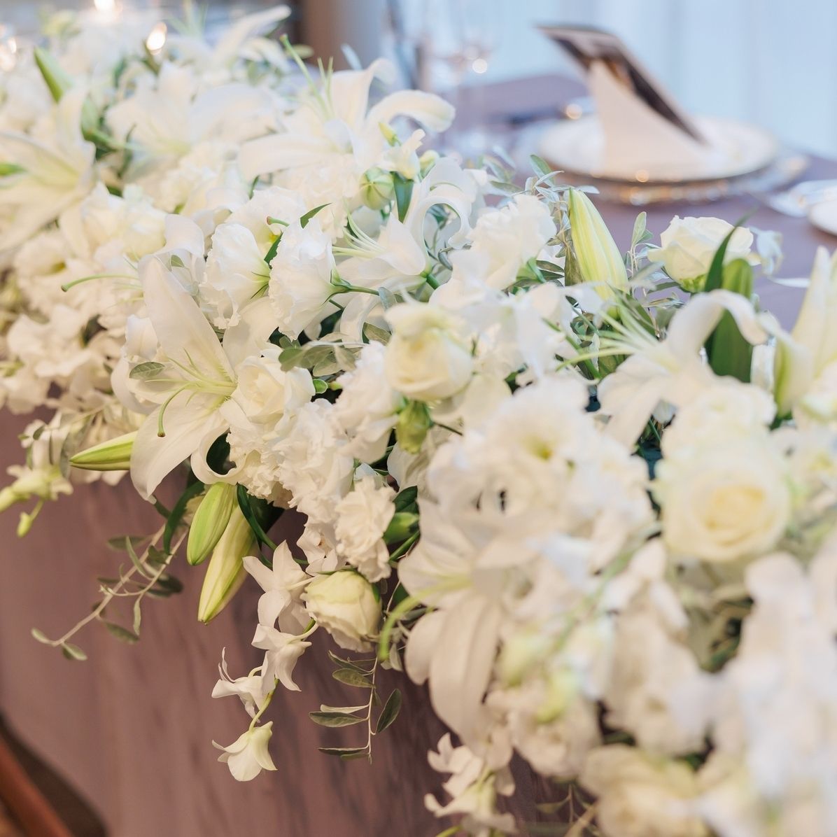 装花は白と緑で統一し、高砂は少し流れを出して、ゲストテーブルは水中花も混ぜて2パターンお願いしました。