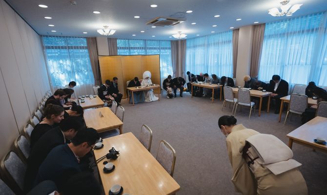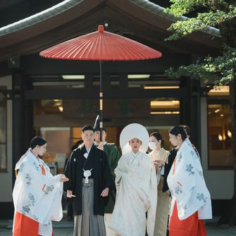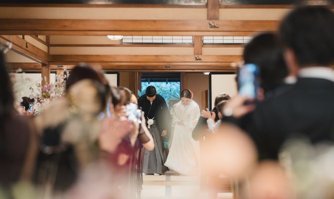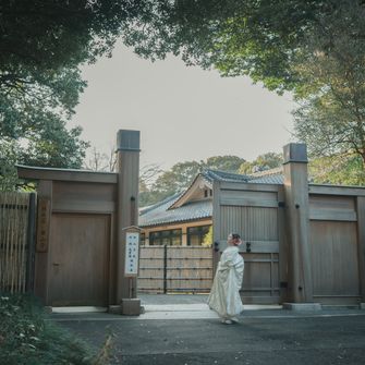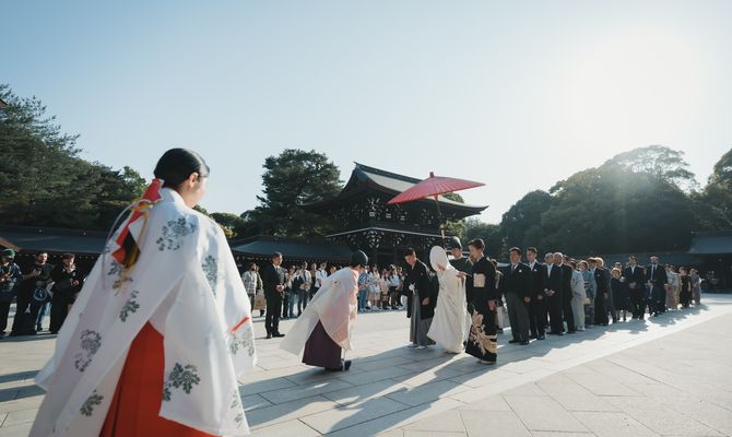 海外在住で外国人のゲストも多く、また私たちのルーツである日本の文化を表せる場所で式を挙げたかったので、とにかく『和』にこだわったテーマに絞りました!場所は『神前式ができる神社』、『和室で披露宴が行える会場』という条件で探し、庭園付きのプライベートな空間が創れる桃林荘に惹かれ、ツアーの際に即決しました!明治神宮で挙式、桃林荘で披露宴という1日の流れにすることに迷いはありませんでした。