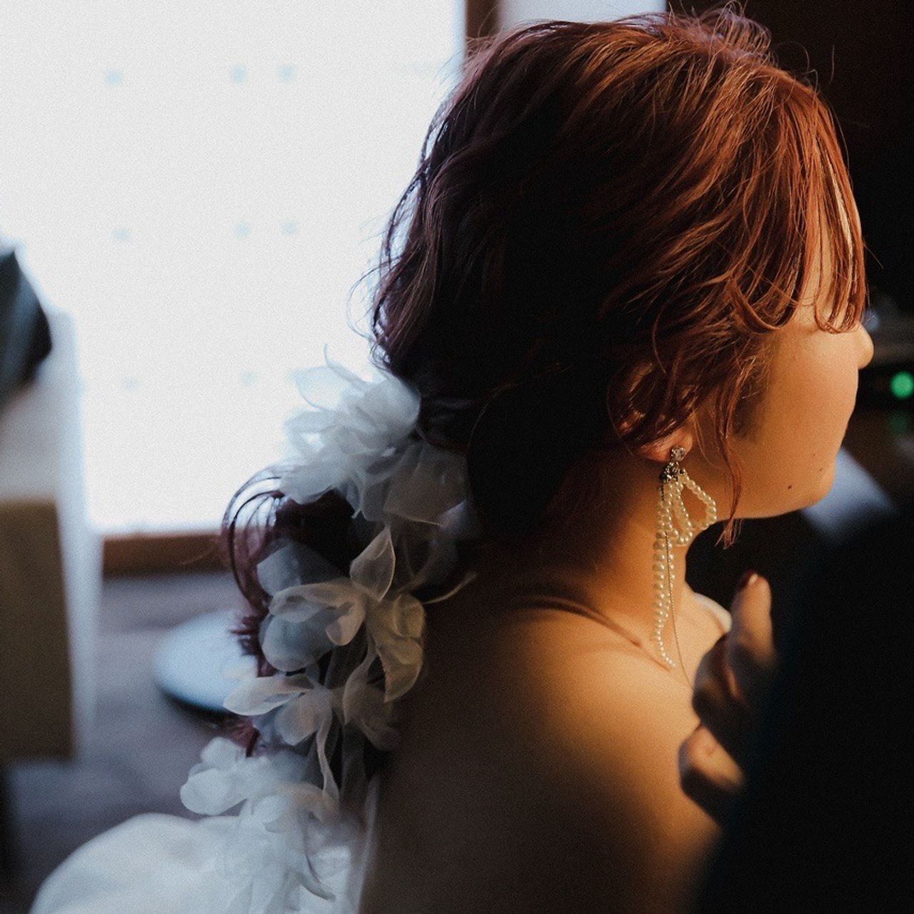 ウェディングドレスのときには、ふわふわのリボンを軽く巻きました。