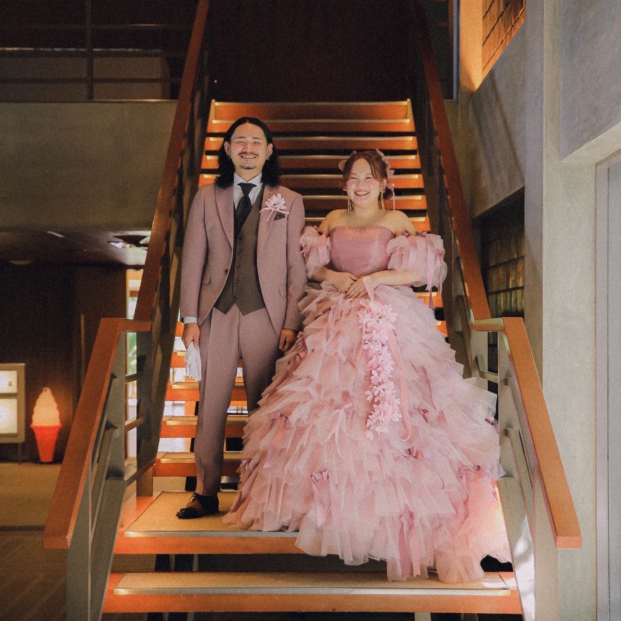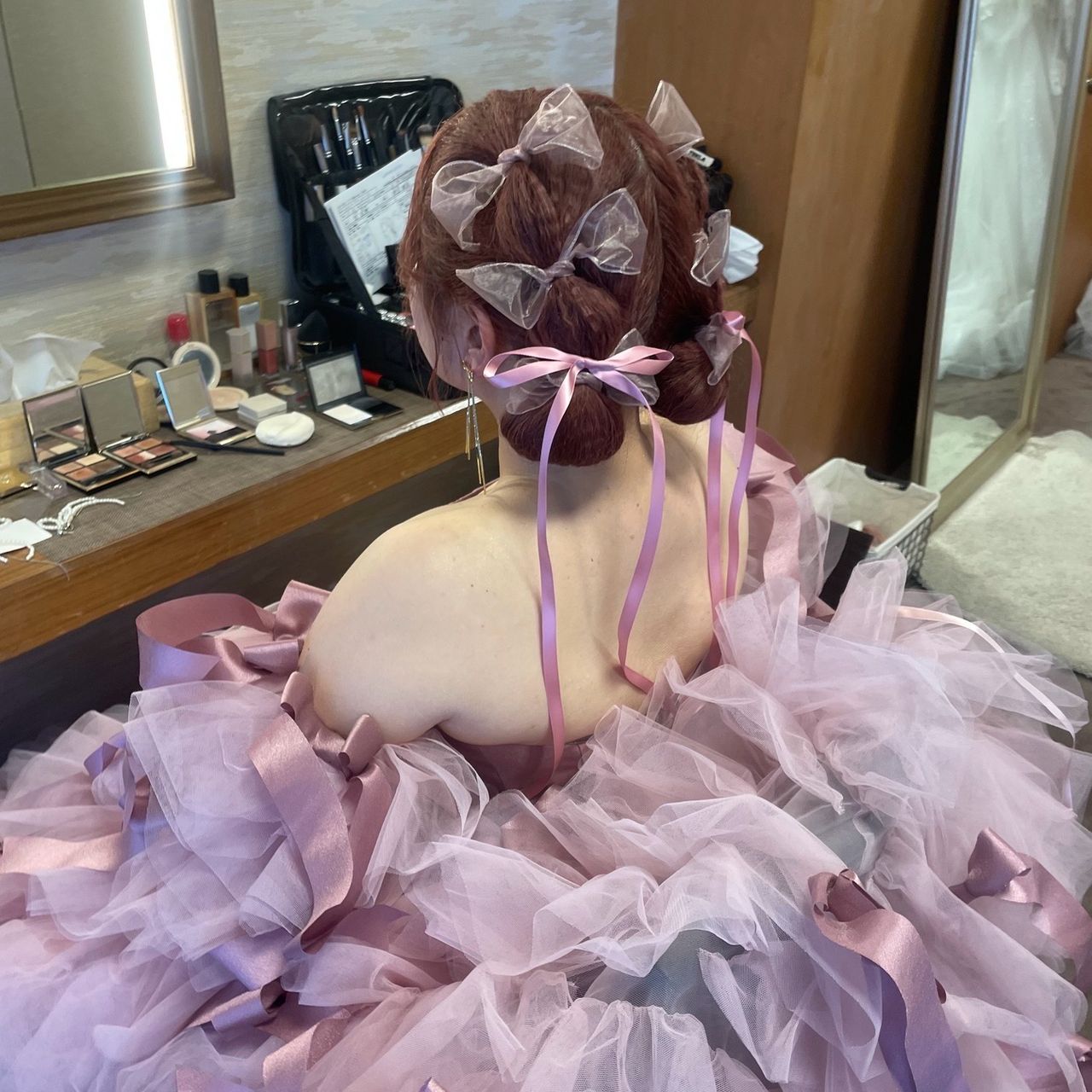 カラードレスもたくさん試着して迷いましたが、SNSで見て可愛いと思っていた"ピンク×リボン"のラブリーなドレスを着て、即決しました!