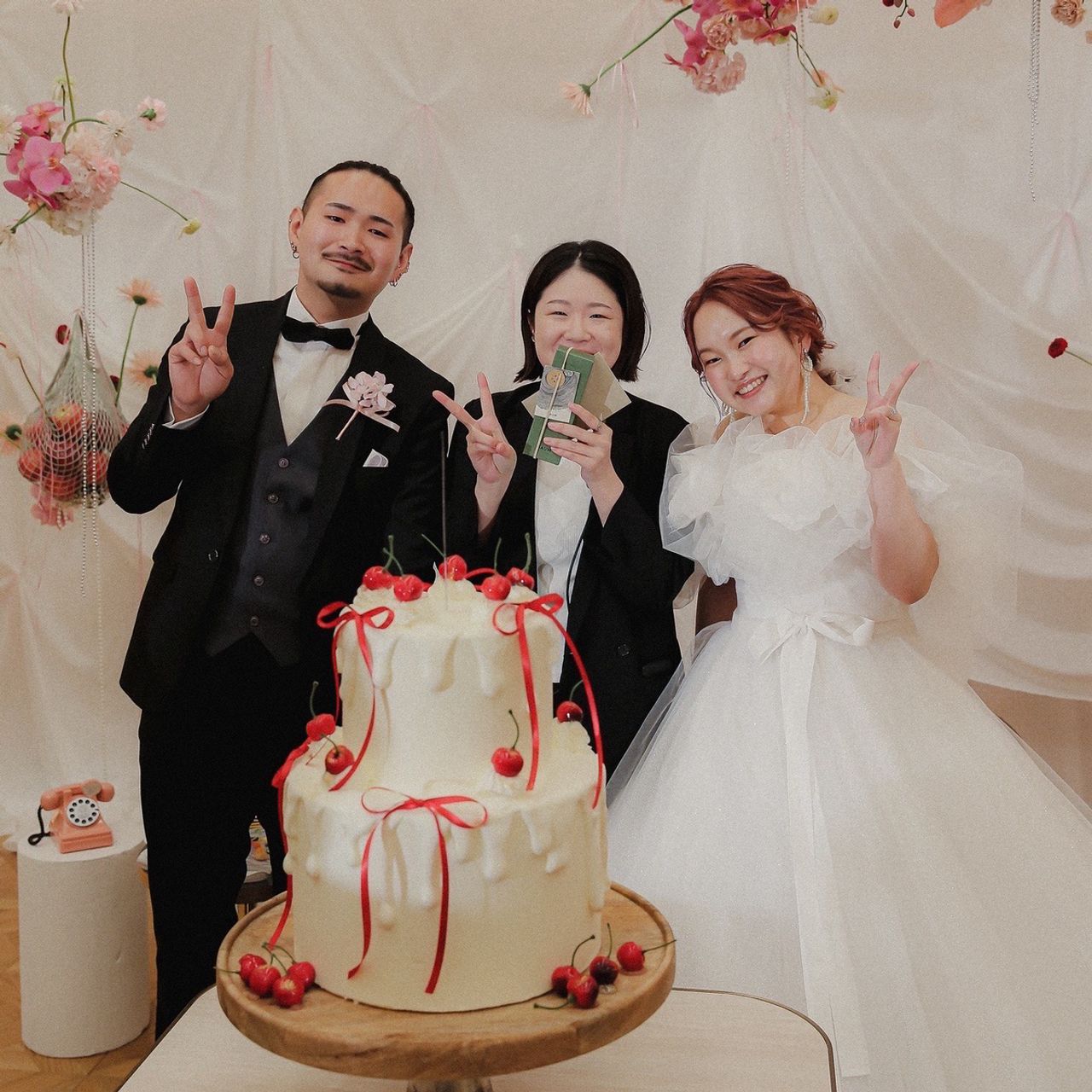 レトロポップを意識し、赤リボンとさくらんぼが乗ったウェディングケーキにしました。
