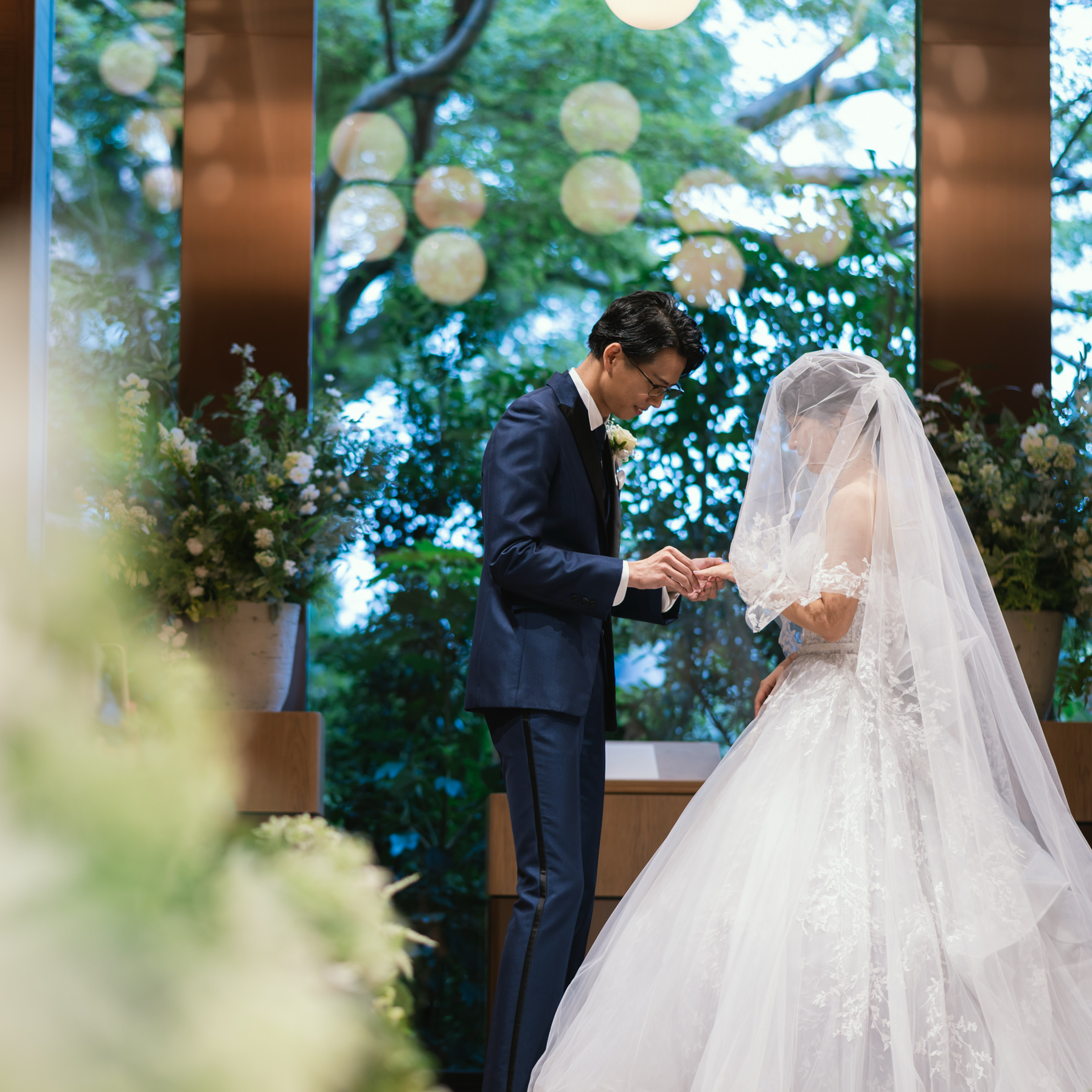 あたたかく落ち着いた雰囲気の木目のチャペルと正面のガラスから見える外の緑とガラスに反射するライトが素敵です💓