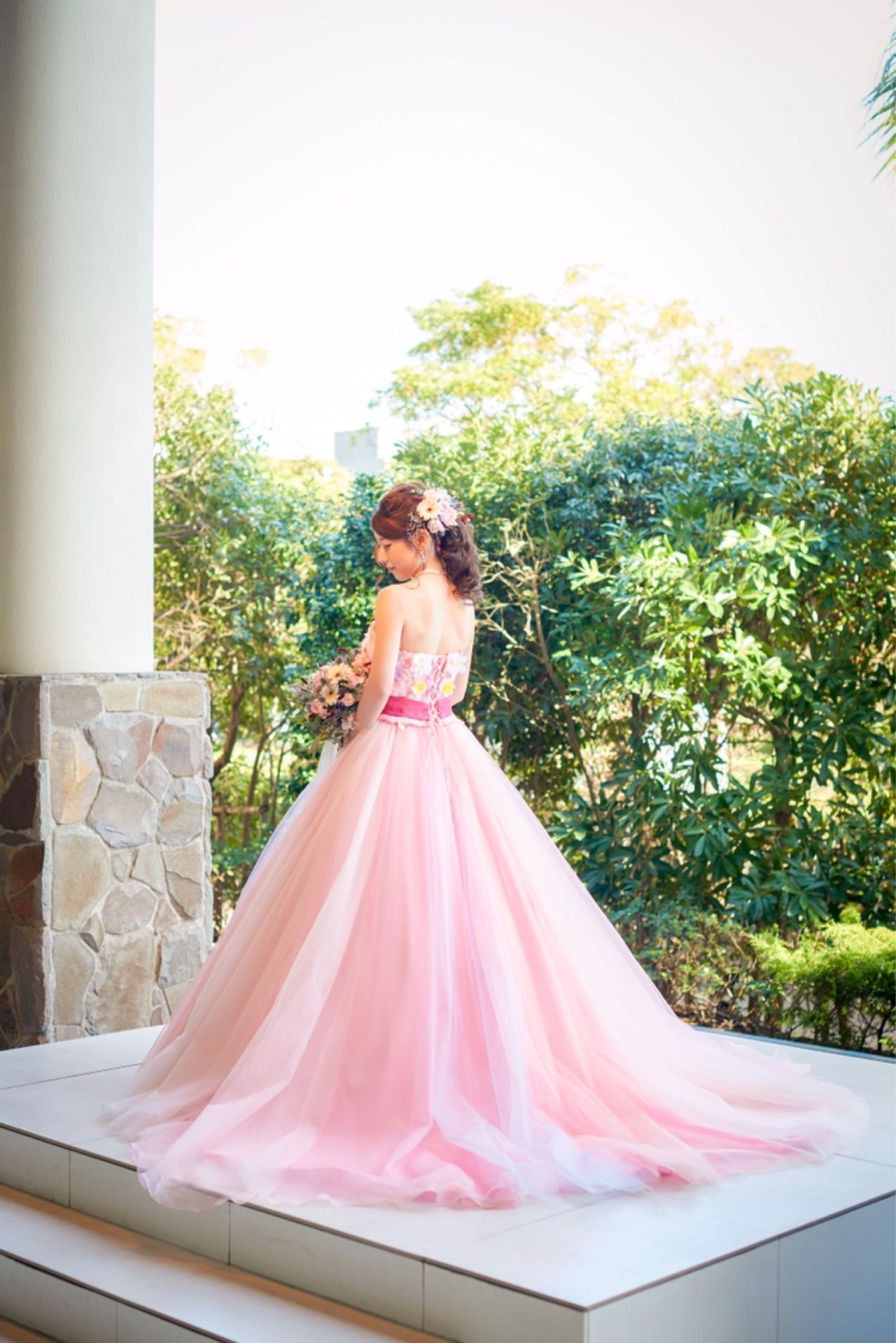 ウェディングドレスの時にブルーのリボンだったので統一感を出すためにカラードレスでも腰にリボンがあります!