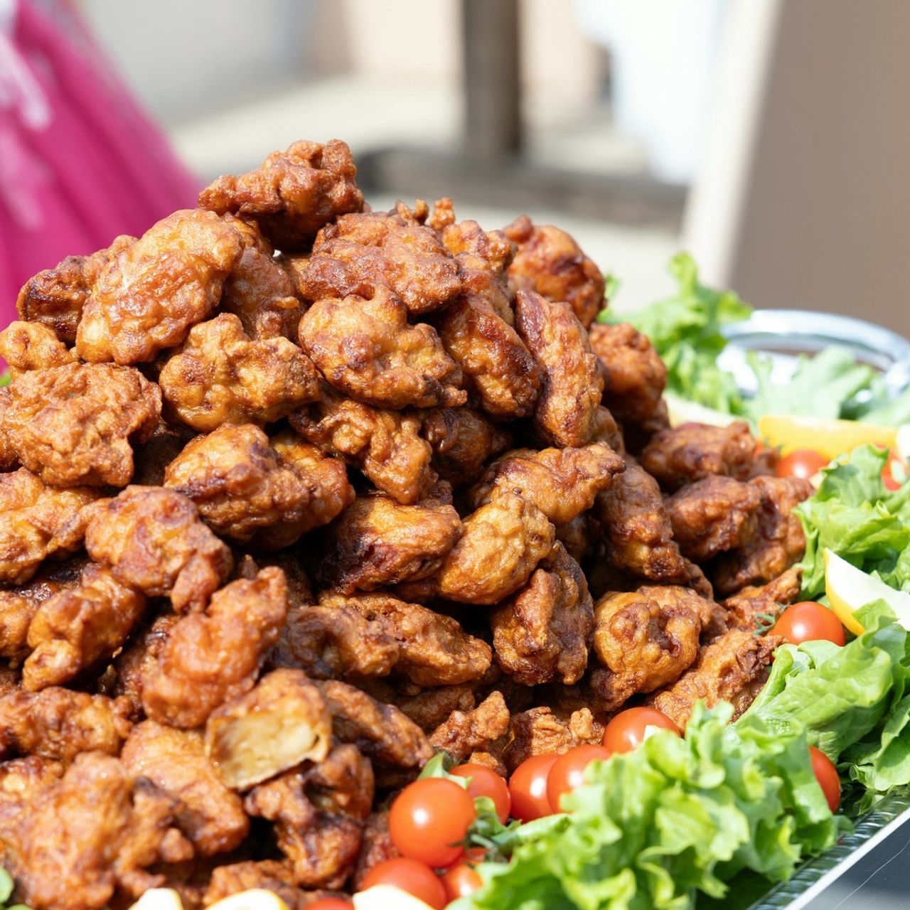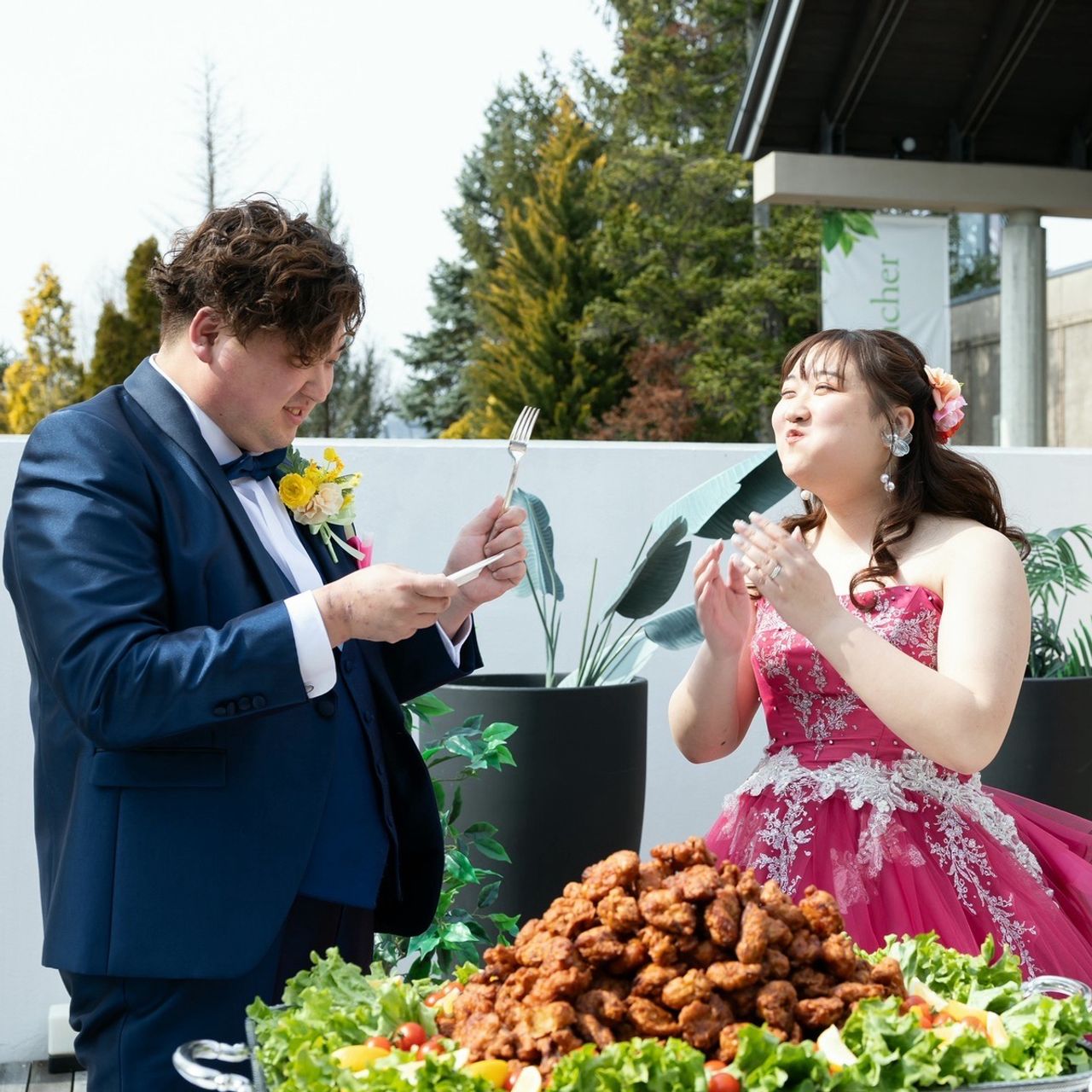 さらに、カラードレスのお色直しで行ったドレスの色当てクイズの正解者には、唐揚げをサンクスバイトして、残った唐揚げは披露宴内で唐揚げバイキングとしてゲストの皆さまにも楽しんでいただきました。