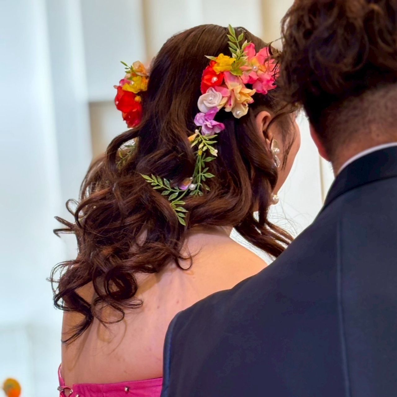 カラードレスでは、ピンクを基調とした造花をつけて、それぞれのシーンに合わせて雰囲気を変えています。