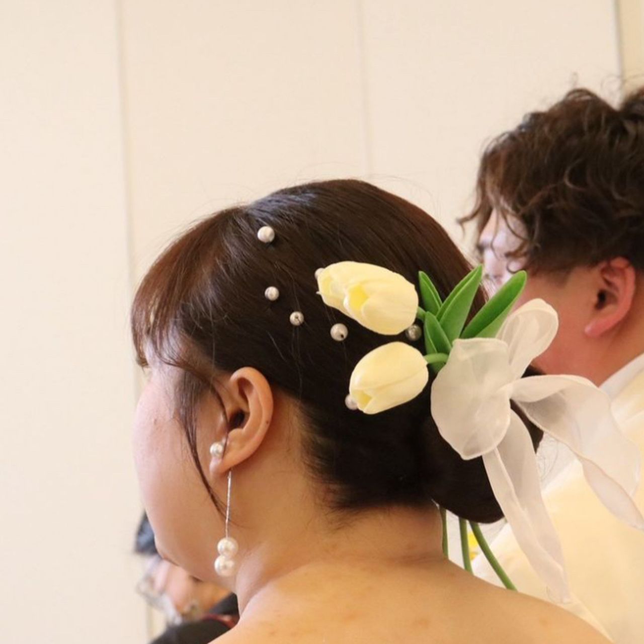 挙式ではパールを中心にしたシンプルで上品なデザインにまとめ、披露宴では春らしさを感じられるよう白いチューリップの造花をあしらいました。