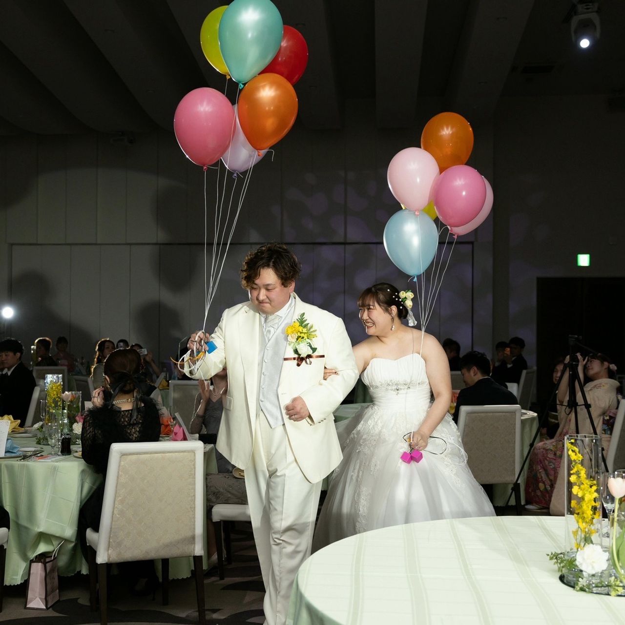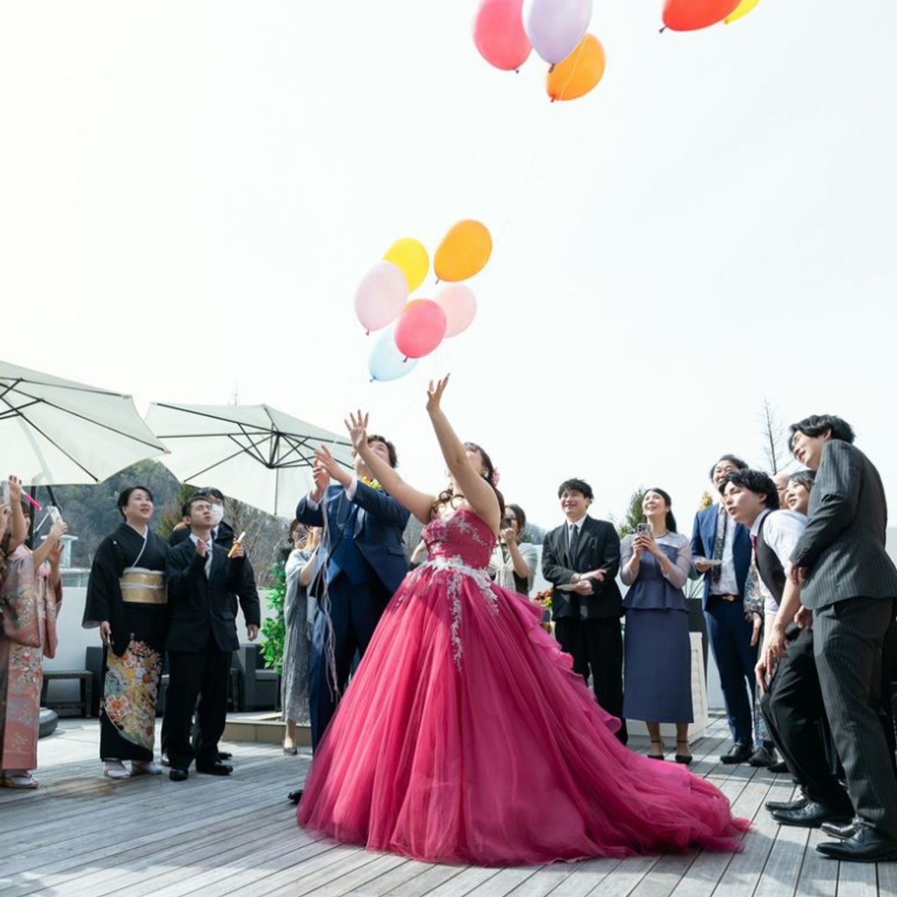 本当は、ゲスト全員でバルーンリリースを行いたかったのですが、ヘリウムガスの高騰により断念し、みんなに見守られる中で私たち二人のみのバルーンリリースを行いました。