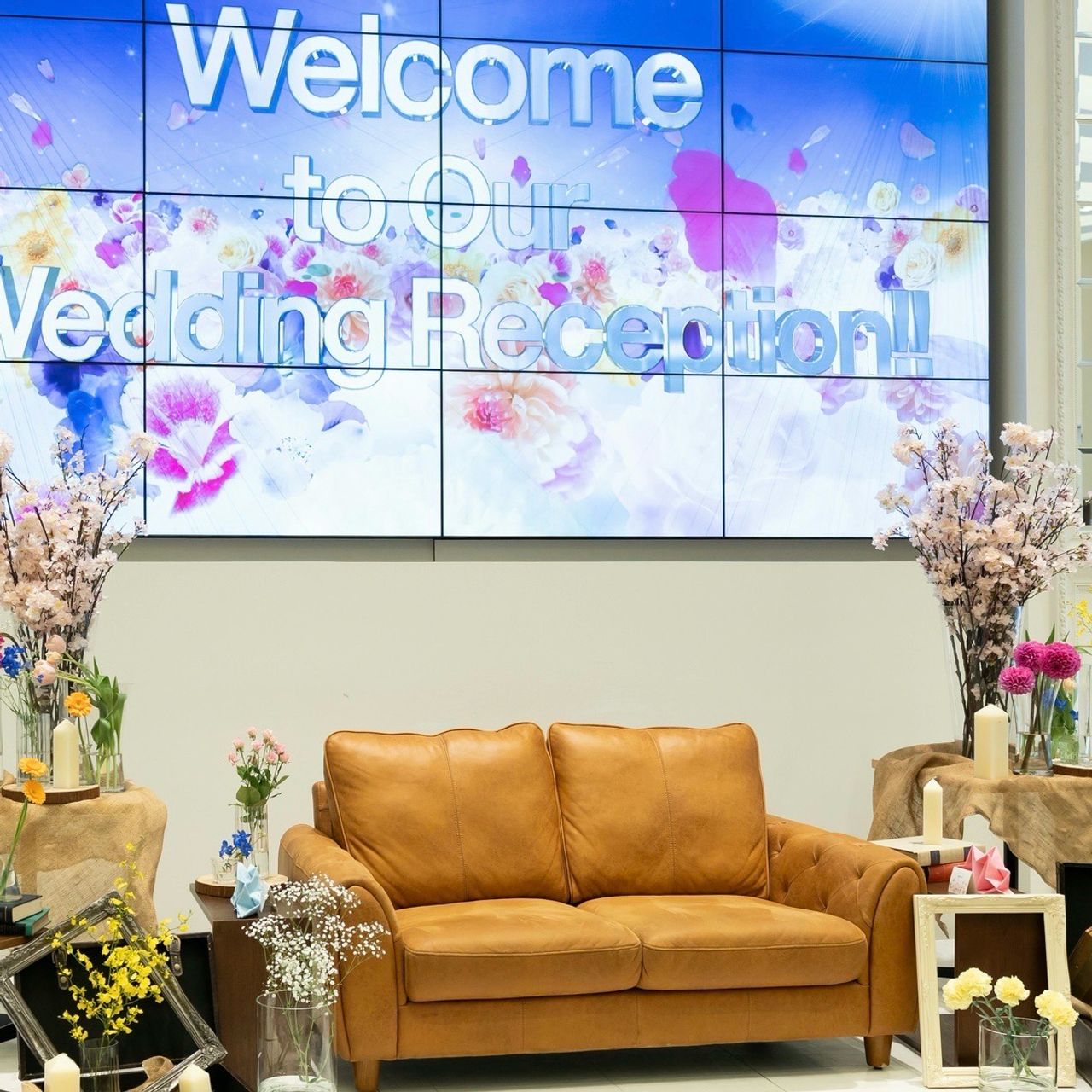 式場と提携しているお花屋さんにお願いし、特定の花の種類にはこだわらず、ピンクや黄色、オレンジなどの明るくポップな色合いにしてもらいました。チューリップや桜の造花なども使っていただいています。
