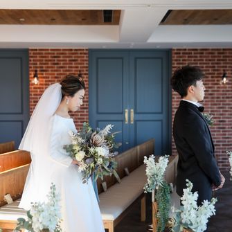 というテーマを担当のプランナーさんが決めてくれました。denimが好きな私たちにぴったりなテーマで当日会場の装飾にdenimを使用したり、自分たちで脱色し、その生地をメッセージカードの台紙にしたりテーブルナンバーとして生地に刺繍し皆さんのメニューにそれぞれつけたりしました。
