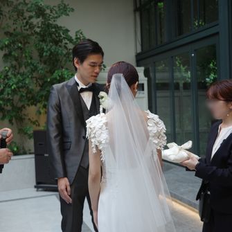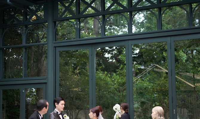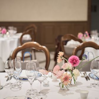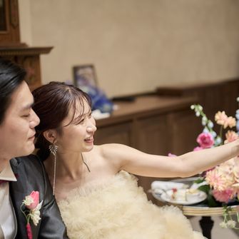 テーマ『modern classical × romantic』リストランテASOの洋館のクラシカルな雰囲気、代官山というモダンなエリアの良さを併せ持つ会場に、トレンド感のある装花や装飾をしたいという想いでテーマを決めました。テーマカラーは、新緑の季節と会場の内装に合うようなピンク、ベビーブルー、ネイビーです。華やかな色合いながら2人らしい、優しい空間作りにこだわりました。
