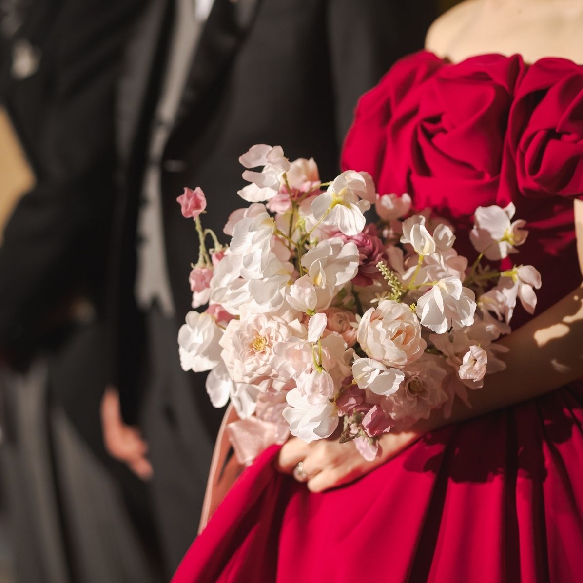 お花はホワイト、淡いピンク、マゼンダピンクをメインに春らしさと曲線をテーマに仕上げていただいています!濃いめの色も入り、大人可愛いイメージです。
