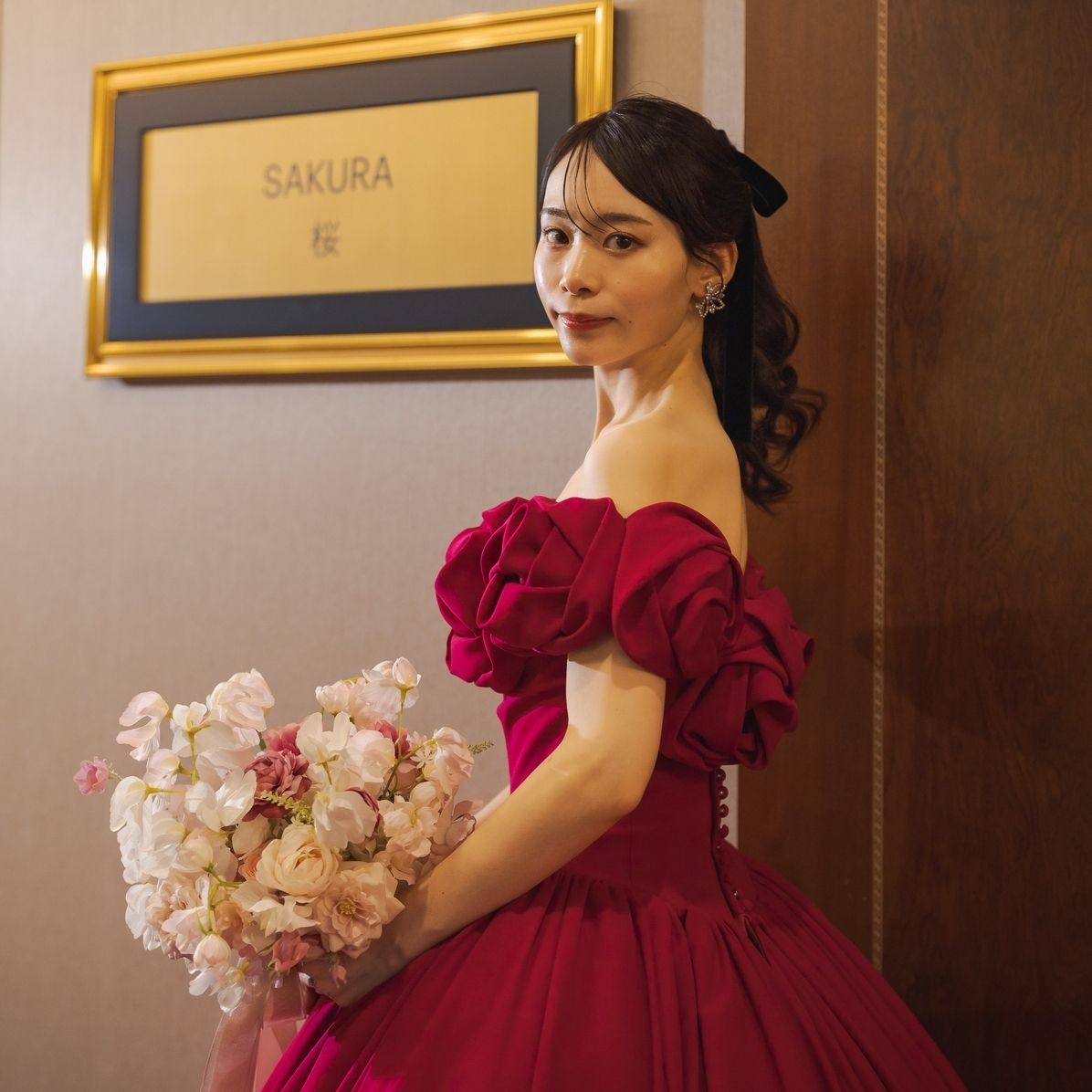 肌が明るく見えるピンクを選んでいます。マゼンダピンクの色味がウェスティンホテル東京にぴったりでした!