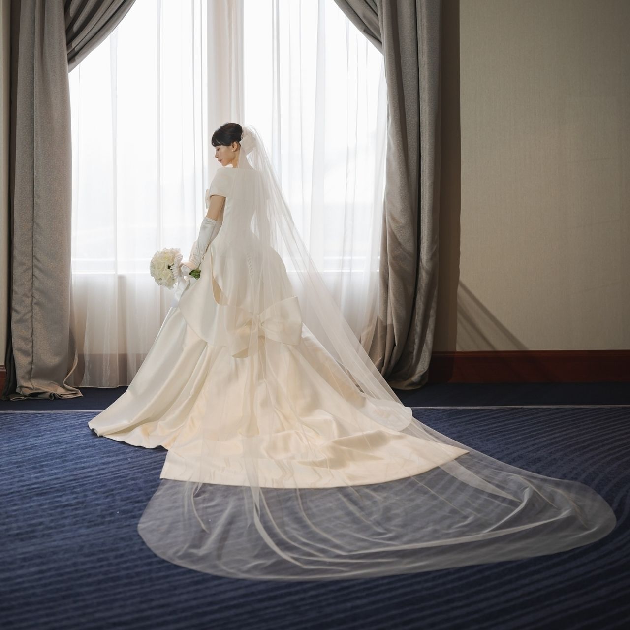 深いブルーの絨毯にウェディングドレスの白が際立ち、美しいだろうなと思いました。