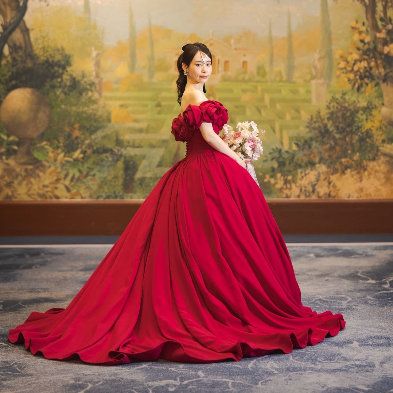 胸元の大きな薔薇とボリュームのあるプリンセスラインが華やかなデザインです。