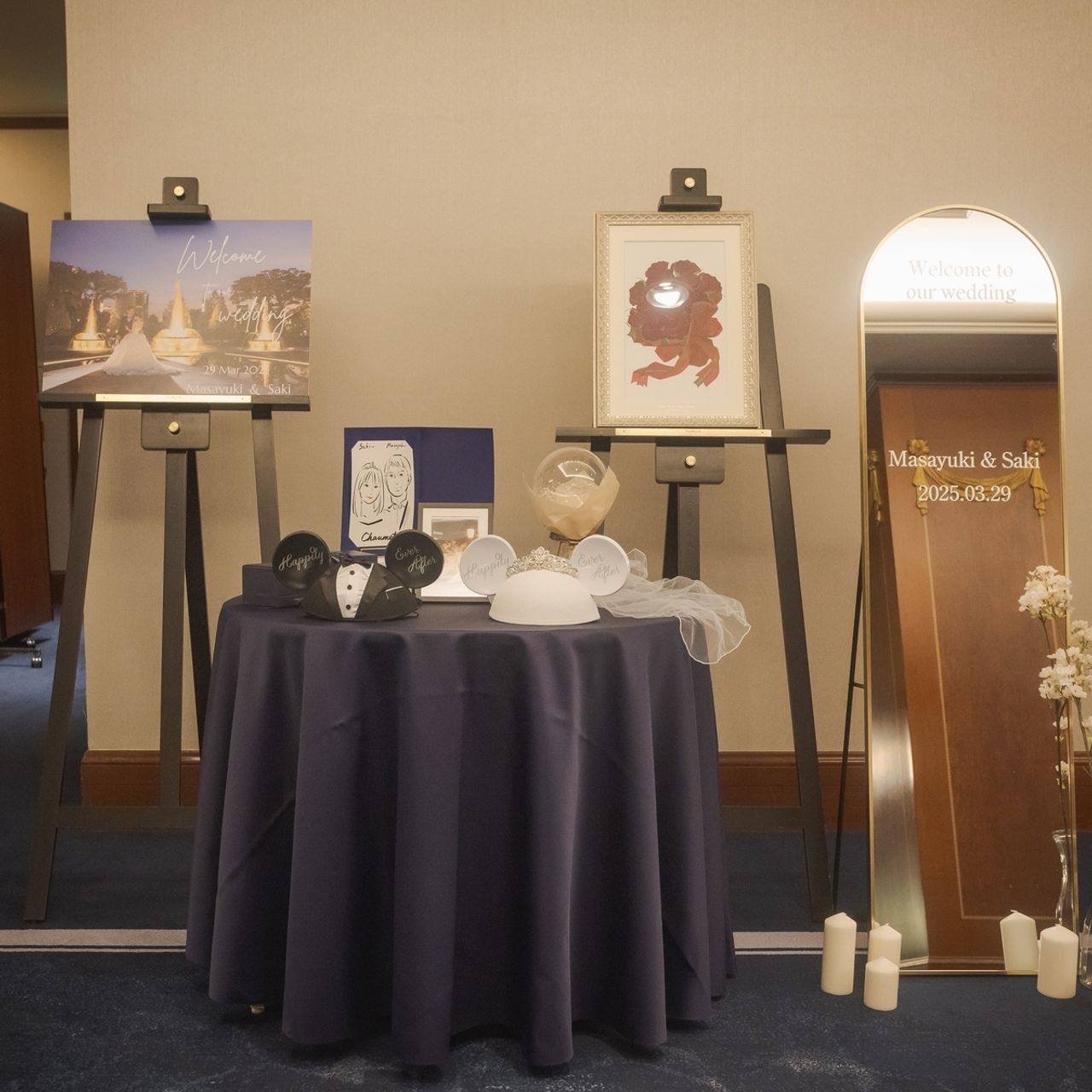 ウェルカムスペースは、ほとんど家にあったもので揃えています。ウェルカムボードはプリントパックで印刷しました。