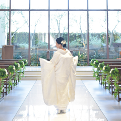 天井が高く、正面のガラスから自然光がたくさんはいるチャペルです。ナチュラルグリーンも似合う素敵な会場です。