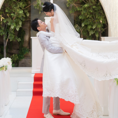 ペット可なので、リングドッグができてとても嬉しかったです。バージンロードには花びらや絨毯をオプションで追加でき、私はペットの犬が滑らないように赤絨毯を選びました。白い会場に赤がとっても映えていてよかったです。