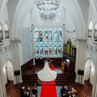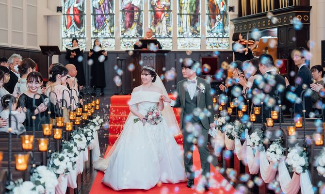「今までお世話になった方々に感謝を伝える」「お花」「クラシカル」をテーマに行いました。神戸セントモルガン教会(KOBE St.MORGAN CHURCH)の決め手は、大きなステンドグラスに赤い絨毯のある大聖堂で、とてもクラシカルな雰囲気がある会場だったからです。