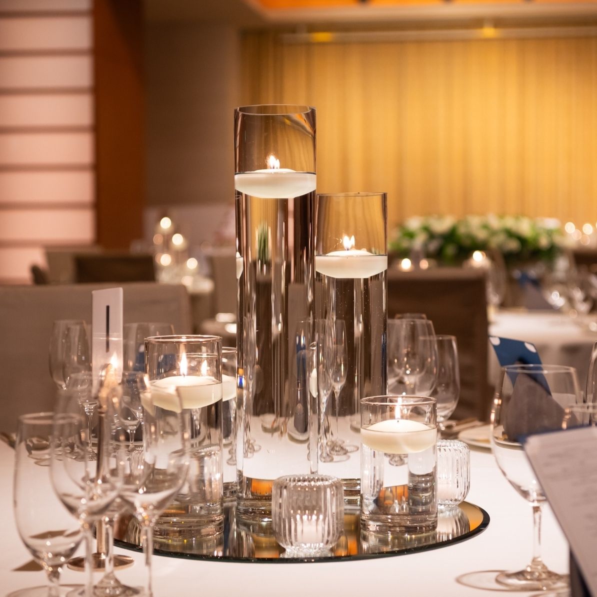 夕方からの式だったので、キャンドルをたくさん置いて空間を演出しました!テーブル装花は生花を全く置かず、キャンドルだけにしています。幻想的な雰囲気になって、とても素敵な空間を作ることができました。