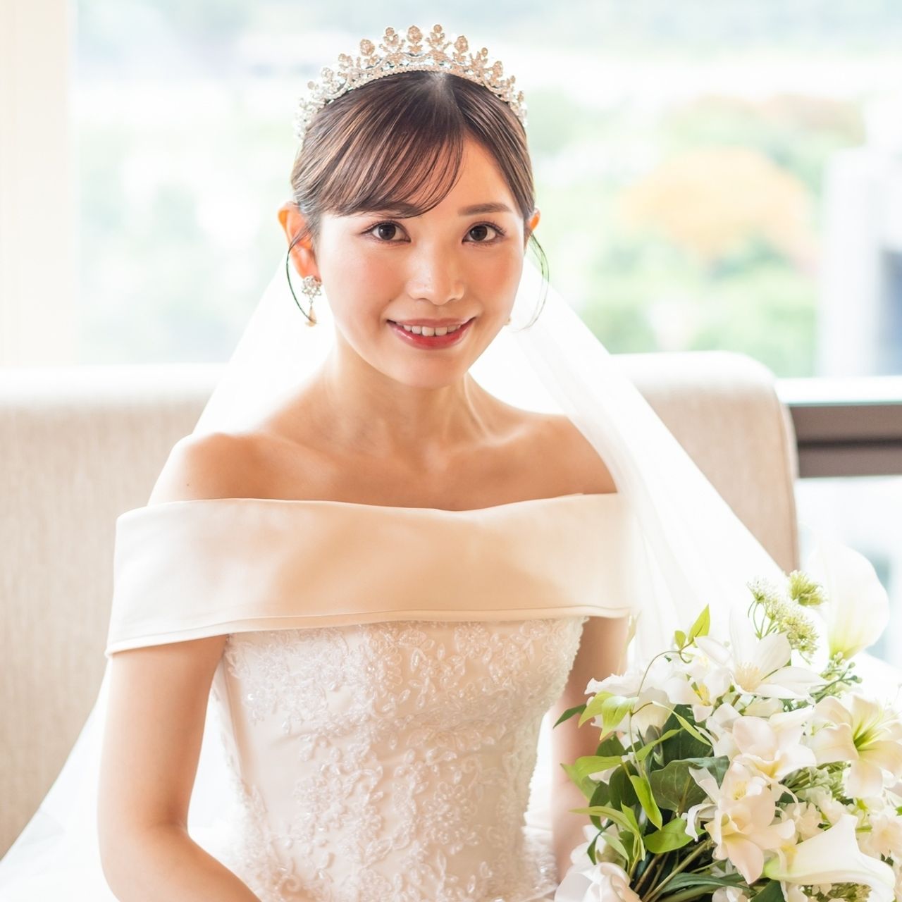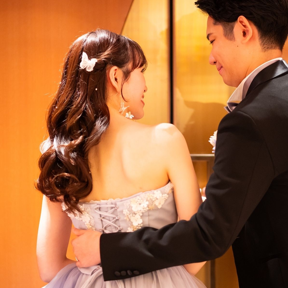 髪型は、ウェディングドレスではツルッとしたシニヨン、カラードレスではハーフツインにしています。