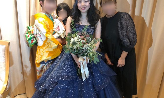 ウェディングケーキでは、私の好きな紫色のグラデーションにしてもらい金銀のアラザンや金箔をちりばめた美しいケーキにできたと思います。いろんな種類のベリーとぶどうをおいてもらい、その中には私たちの好きな音楽の象徴の音符のチョコレートを飾っていただきました。