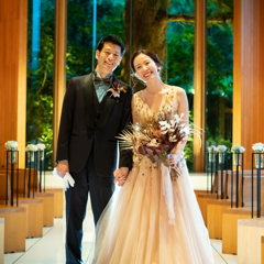 教会の中に入ると杉の木がふわっと香り、ガラス越しの緑が映える素敵な空間で、祭壇の奥に見えているシンボルツリーがとても神秘的です。本当に森の中で結婚式を挙げているようでした。端の人まで見やすいように設計されたゲストの客席も嬉しいポイントです。