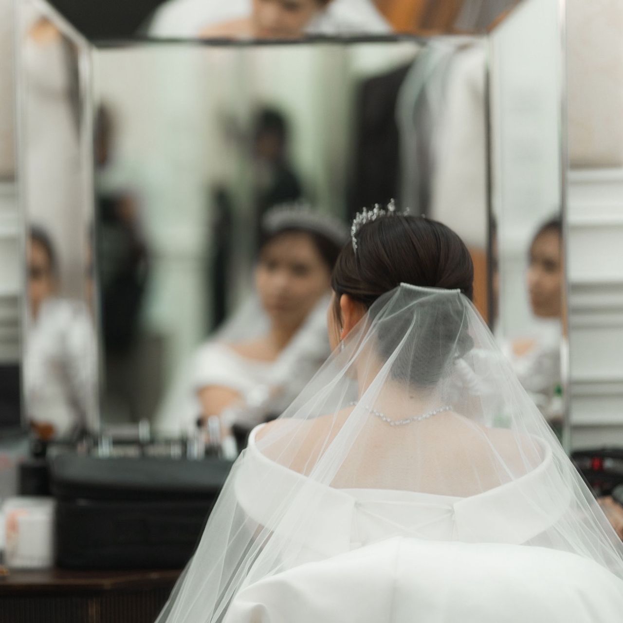 挙式は髪型のアップスタイルが見えるように、折り目のない、薄いベールを選びました。