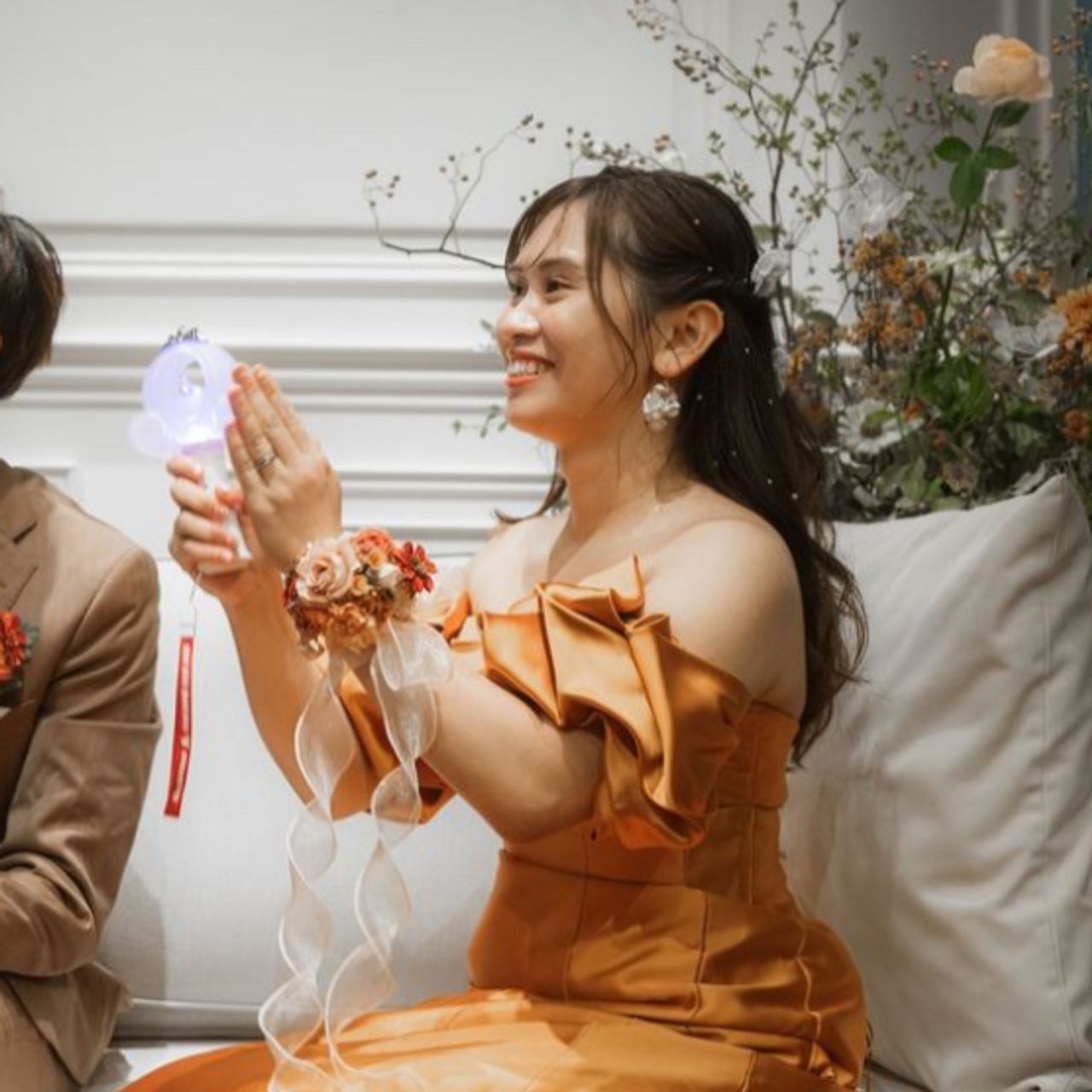 披露宴はリストブーケを着用し、手をあけることで華やさを出しつつ、みんなとハグしたりペンライトを持ったりできました。