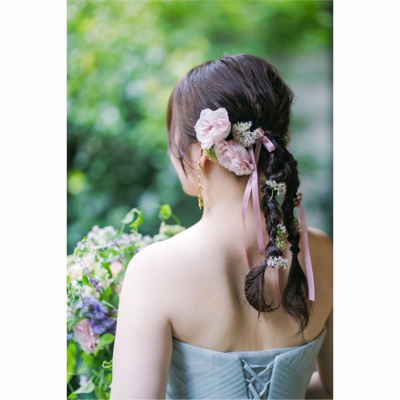 生花にこだわりたかったので、当日ブーケで余ったお花を分けていただいて、持ち込みのリボンを合わせてヘアメイクさんと相談しながら即興でセットしていただきました!