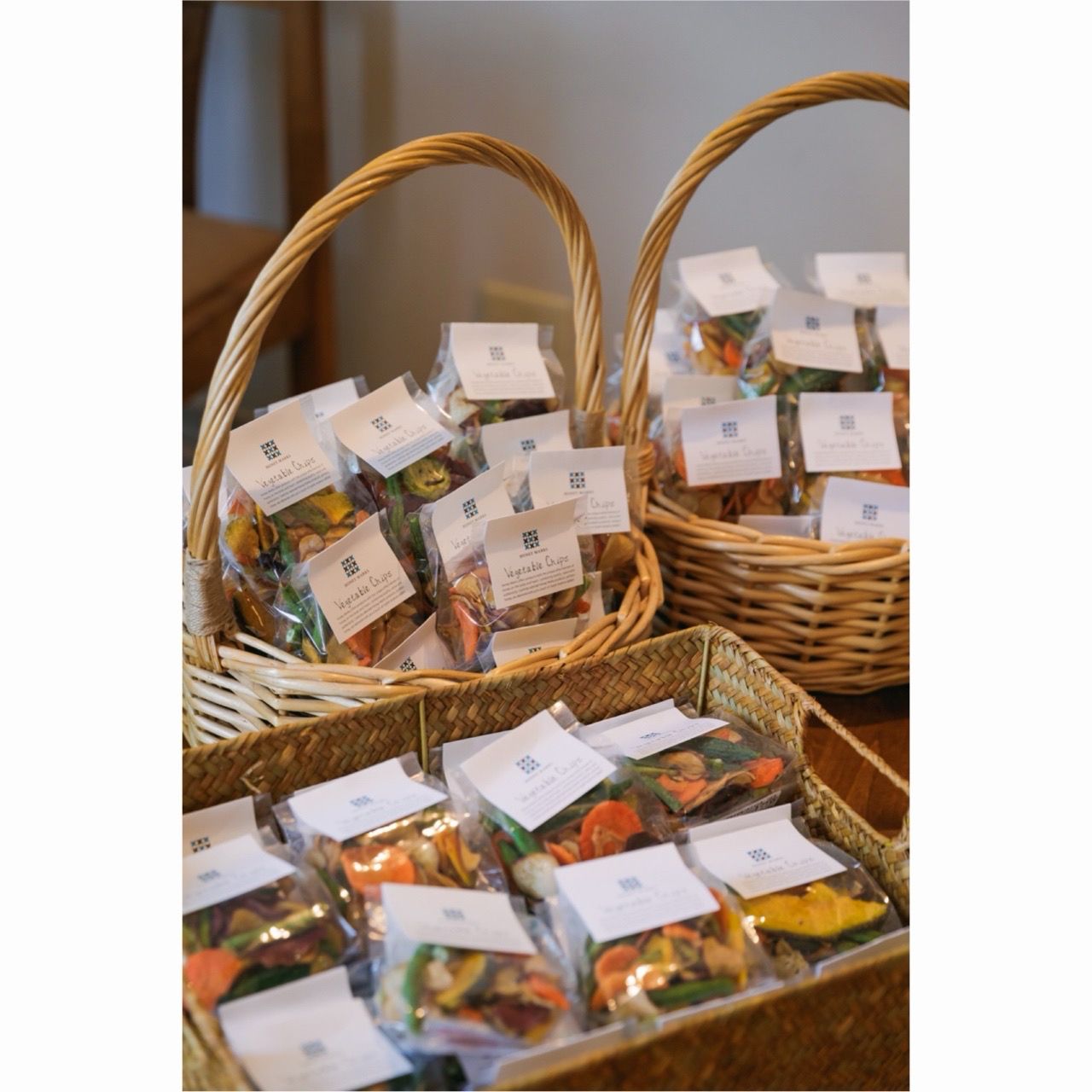 披露宴のデザートや引き出物は甘いものに偏りがちなので、しょっぱいものをと思いベジタブルチップスをチョイス。見た目も鮮やかでカゴに並べると更に可愛らしかったです。「帰ってすぐ食べたけど、おいしかったよ!」との声をたくさんいただきました!