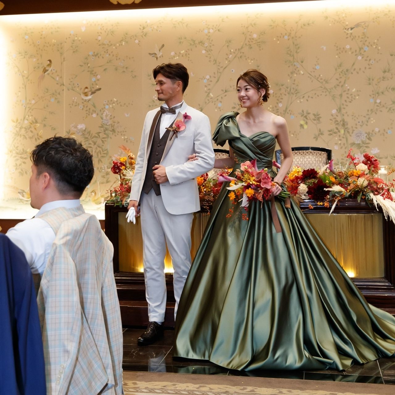 お色直しはピアスに合わせたゴールドのフラワーとリーフがモチーフのアクセサリーを付けています。