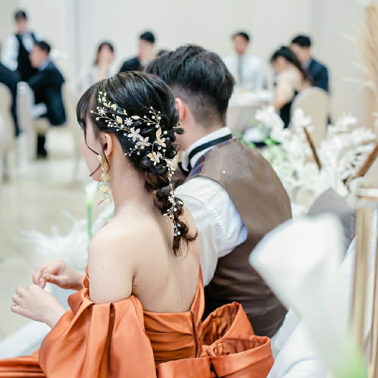 カラードレスでは編み下ろしの編み込みに巻き付けて、可愛いヘッドアクセサリーを付けてもらいました♪