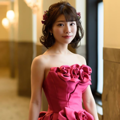 会場装飾に合うように、大人っぽい濃いピンクのカラードレスにしました。胸元がブーケのようにバラが咲いていて、裾も逆さチューリップのようになっていて、とても可愛く気に入りました。