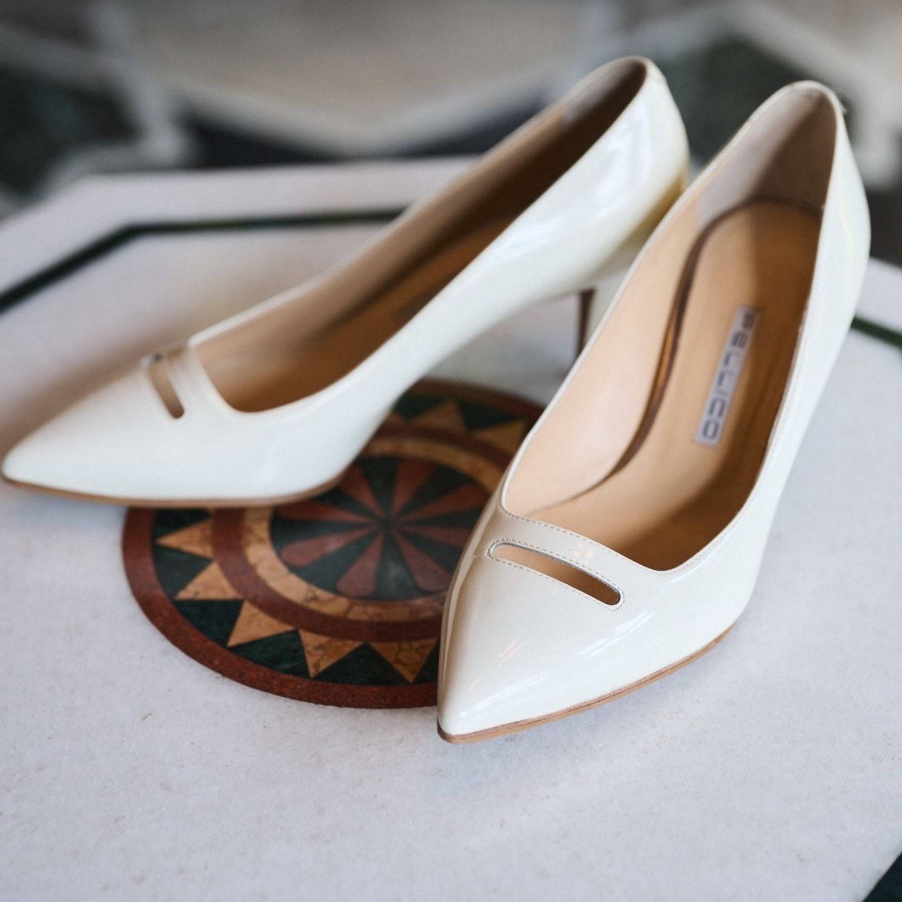 PELLICOのANELLIです。ウェディングシューズであまり履いている方は見たことがないのですが、こちらは指輪から着想を得てデザインされたシリーズだそうで、ウェディングにぴったりだなと感じとても気に入っています。身長164cmでヒールは6.5cmにしました。